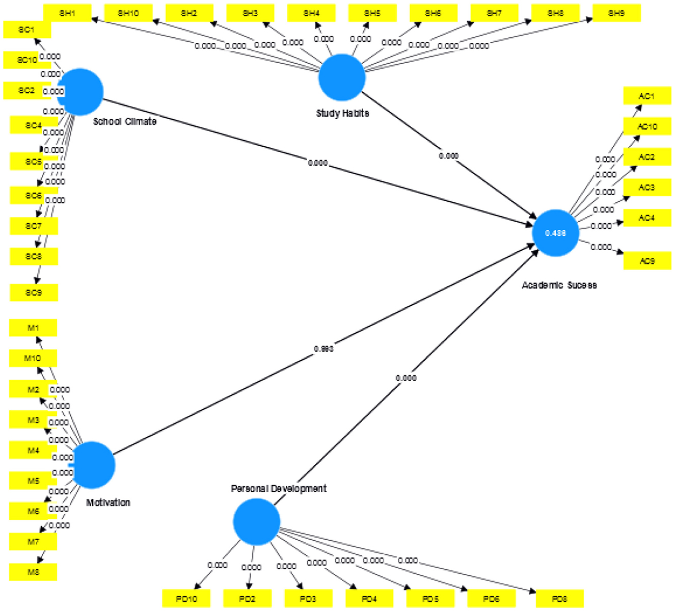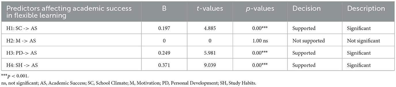This section presents the bootstrapping results, a focused test of the significance of the respondents' perceptions of the study's variables about academic success. Table 4 offers a deeper dive into the relationships, presenting coefficients, t-values, p-values, and hypothesis testing outcomes.
