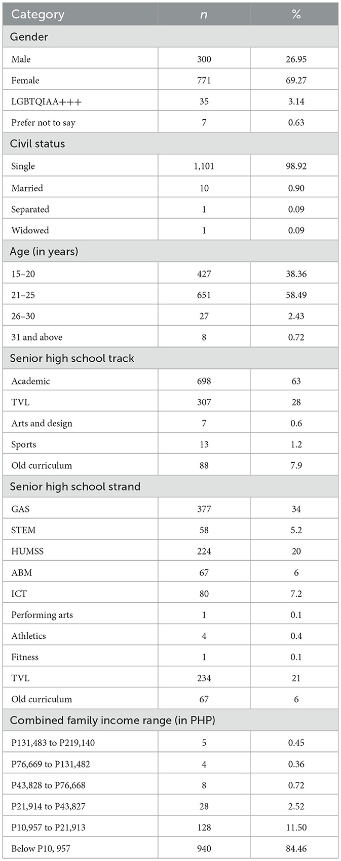 An overwhelming majority of respondents (84.46%, n = 940) reported a monthly family income below Php 10,957. Only 11.5% fell within Php 10,957 to 21,913, and even fewer reported incomes in higher brackets. Notably, 0.45% of respondents reported a combined family income of Php 131,483 or above, highlighting a predominantly low-income sample population.