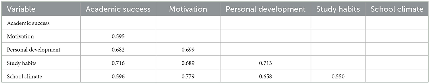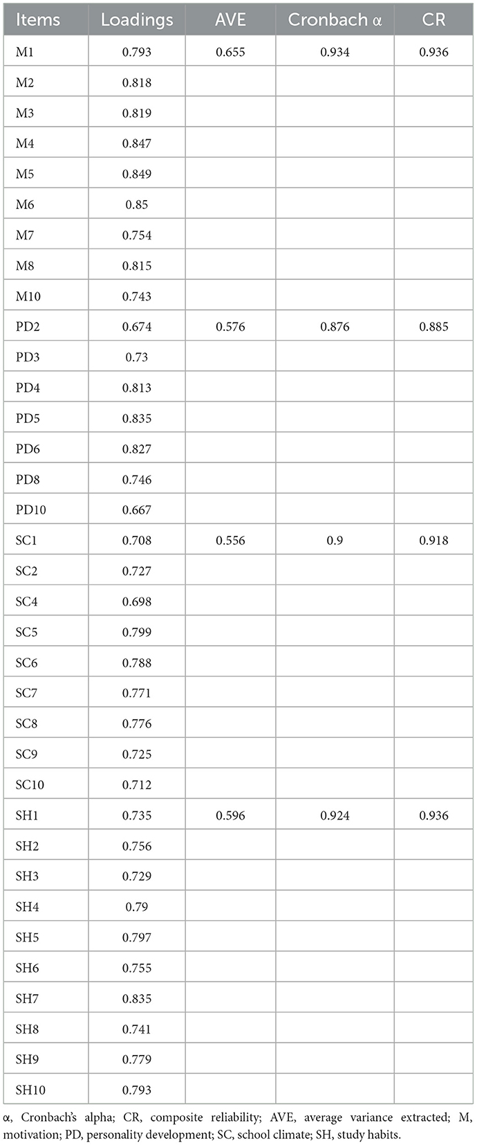 Constructs such as School Climate, Personal Development, Study Habits, proved commendable scores of Cronbach's Alpha and composite Reliability, ranging from 0.876 to 0.934 and 0.885 to 0.936, all categorizing them within the “Excellent” range. The robustness of the study was further supported by the analysis of factor loadings, which continuously fell between 0.667 and 0.850, ensuring individual item dependability (see Table 2).