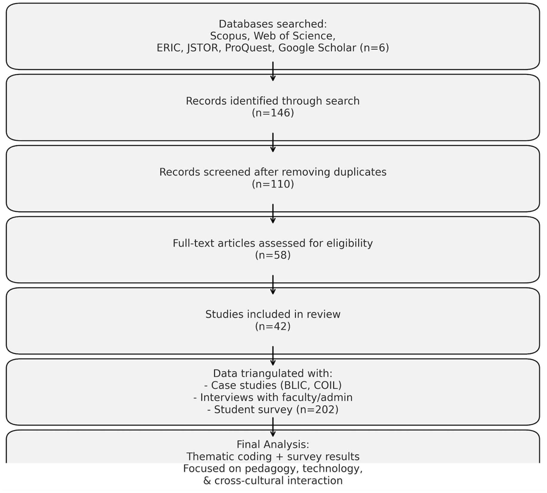 This study employs a mixed-methods approach to explore the integration of blended learning, international cooperation, and innovative pedagogy in management education. It builds upon the Community of Inquiry (CoI) framework developed by Garrison and Akyol (2013), which highlights the interaction of three core elements: social presence, or the ability of participants to identify with the community, communicate purposefully, and develop interpersonal relationships; cognitive presence, or the extent to which learners can construct and confirm meaning through sustained reflection and discourse; and teaching presence, which refers to the design, facilitation, and direction of cognitive and social processes to achieve meaningful learning outcomes (Valverde-Berrocoso and Fernández-Sánchez, 2020). In the context of international blended learning collaborations, the CoI framework supports the development of intercultural communicative competence by fostering environments where students from diverse backgrounds engage in meaningful dialogue and collaborative activities (Valverde-Berrocoso and Fernández-Sánchez, 2020). The literature review was conducted across six academic databases (Scopus, Web of Science, ERIC, JSTOR, ProQuest, and Google Scholar). After applying inclusion and exclusion criteria, 42 peer-reviewed articles and book chapters were selected for detailed analysis (see Figure 1).