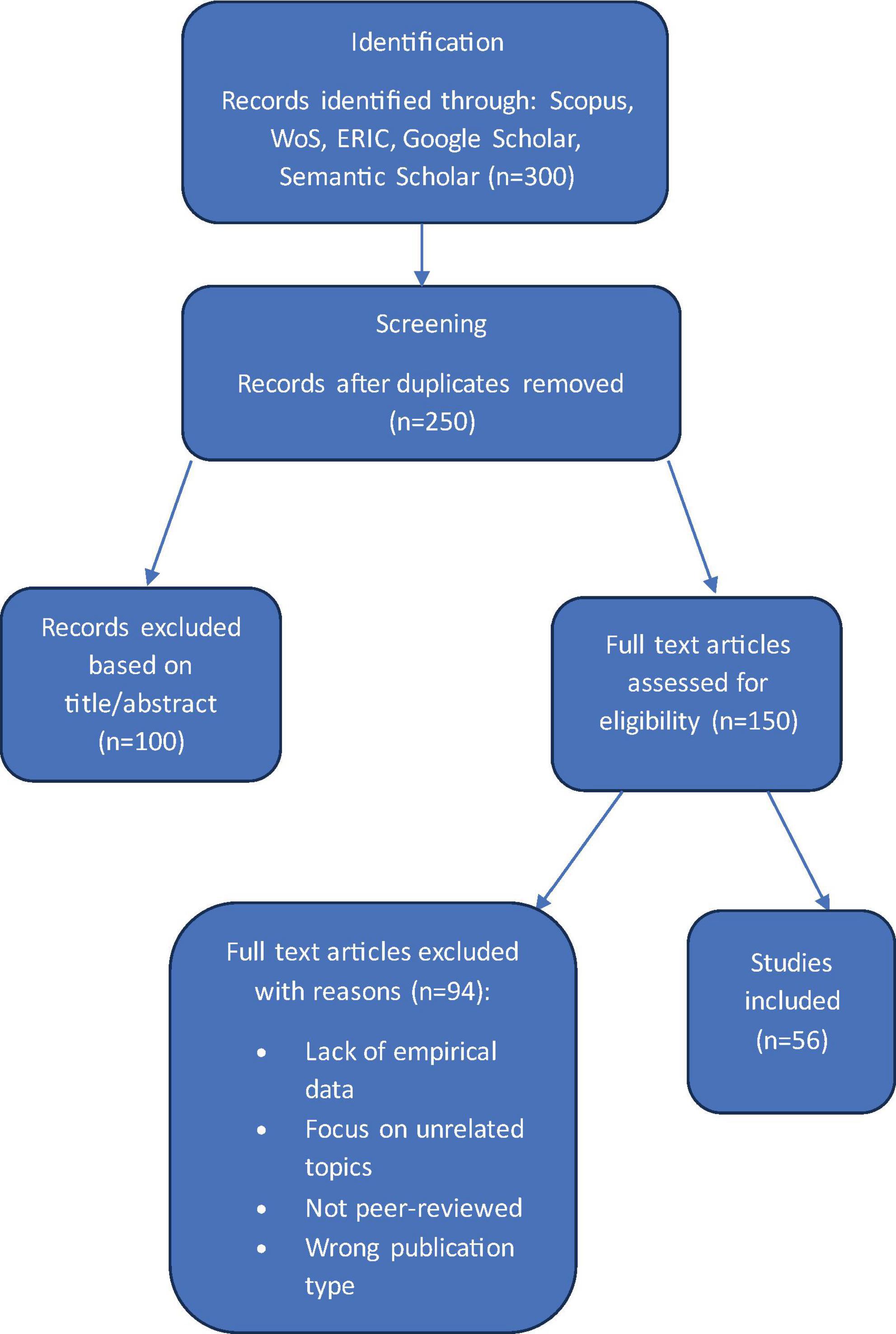 The study included English language peer reviewed articles, conference publications and case studies focusing on integrating environmental sustainability in English Language Teaching, published between 2018 and 2024. Non-peer reviewed articles, book chapters, editorials and opinion pieces were excluded from the study. The study followed the PRISMA (Preferred Reporting Items for Systematic Reviews and Meta-Analyses) guidelines for the selection of articles. Initially, a total of 300 articles were retrieved from the data base. After removing the duplicates (n = 50), a set of 250 articles were selected. The researchers independently screened the titles and abstracts of the 250 articles to evaluate the theme relevant to the study. This examination resulted in selecting 150 articles to the next stage. After conducting a rigorous full-text review of these 150 articles, 94 articles were excluded that do not meet the standards such as lack of empirical data and focus on unrelated topics. This process resulted in selecting 56 studies that met the specific inclusion criteria and theme of the study. Figure 1 shows the selection process of the studies for the systematic review. To ensure the reliability and validity, the researchers independently coded a subset of 15 studies from the total of 56 studies. Any discrepancies occurred were settled through mutual consensus, and the final codebook was then applied for the entire data set.