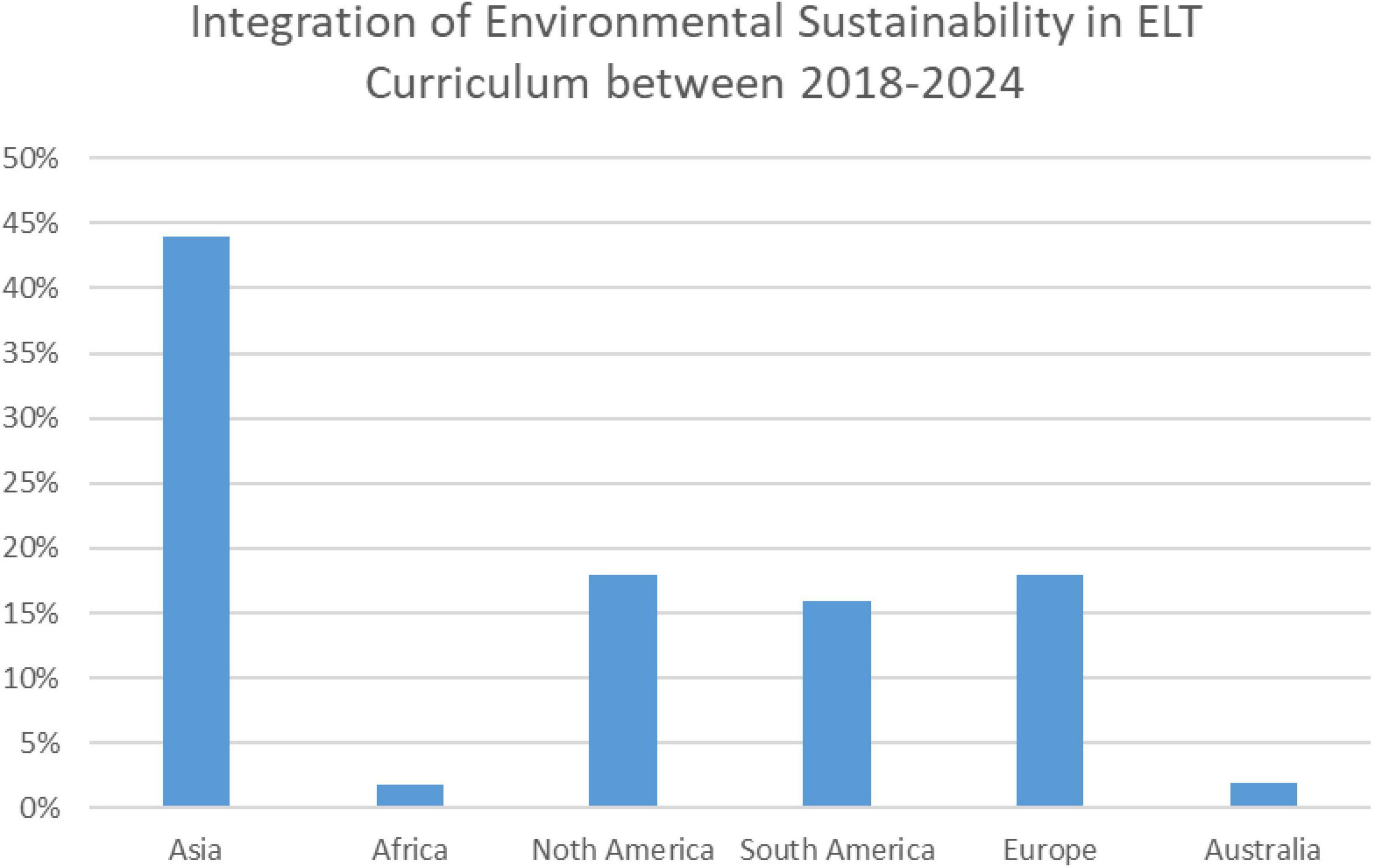 Figure 3 shows the integration of environmental sustainability in ELT curriculum across the continents between 2018 and 2024. Asia leads significantly with 44% integration, indicating a strong emphasis on integration of environmental sustainability in ELT curriculum, followed by North America (18%), Europe (18%), South America (16%), Africa (2%), and Australia 2%).
