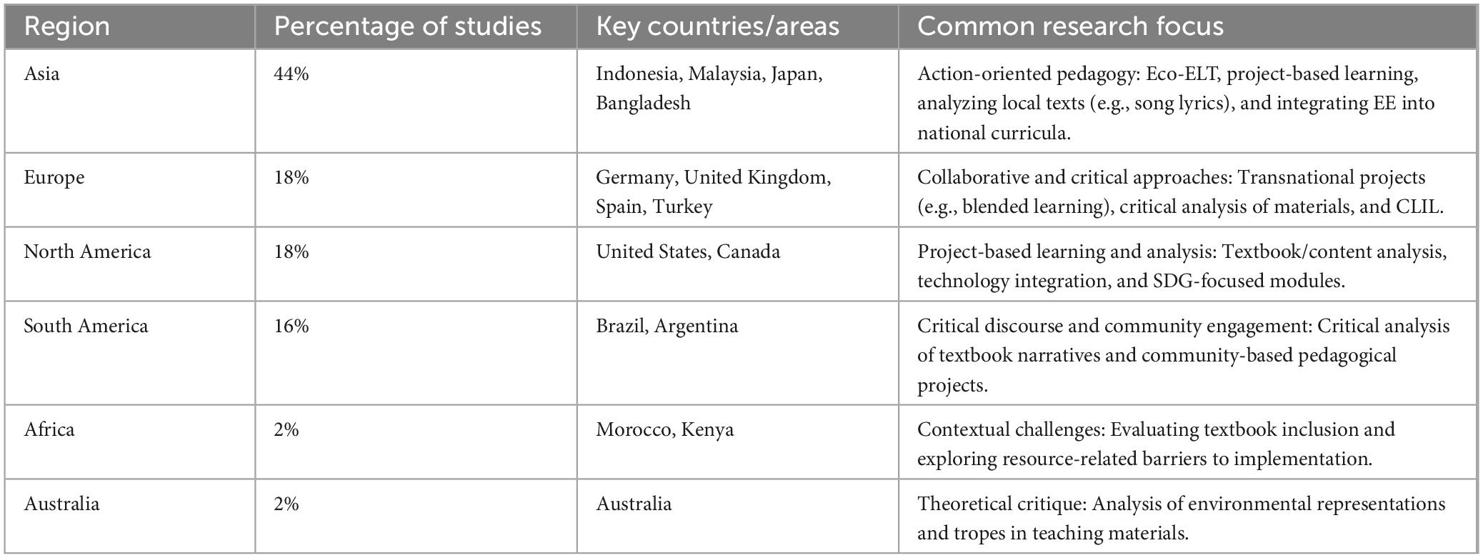 At the regional level, these integrations vary. Practical, material-based integration is frequently prioritized in Asian countries where studies have investigated and produced contents such as song lyrics (Rantung et al., 2023) and school textbooks (Pratolo et al., 2024) to enhance eco-literacy. Research in the United States, particularly in Brazil, has taken a critical stance in scrutinizing textbook content for its over-reliance on institutional sources and its failure to address the socio-economic aspects of environmental issues contributing to a shallow development of environmental critical literacy (Silva and Cristovão, 2019; Cristovão et al., 2022). European projects, including the German-American “Going Green” (Joannis and Kohl, 2020) emphasize the importance of cross-cultural collaboration and learner agency by focusing on sustainability as a platform for linguistic- and intercultural competence.