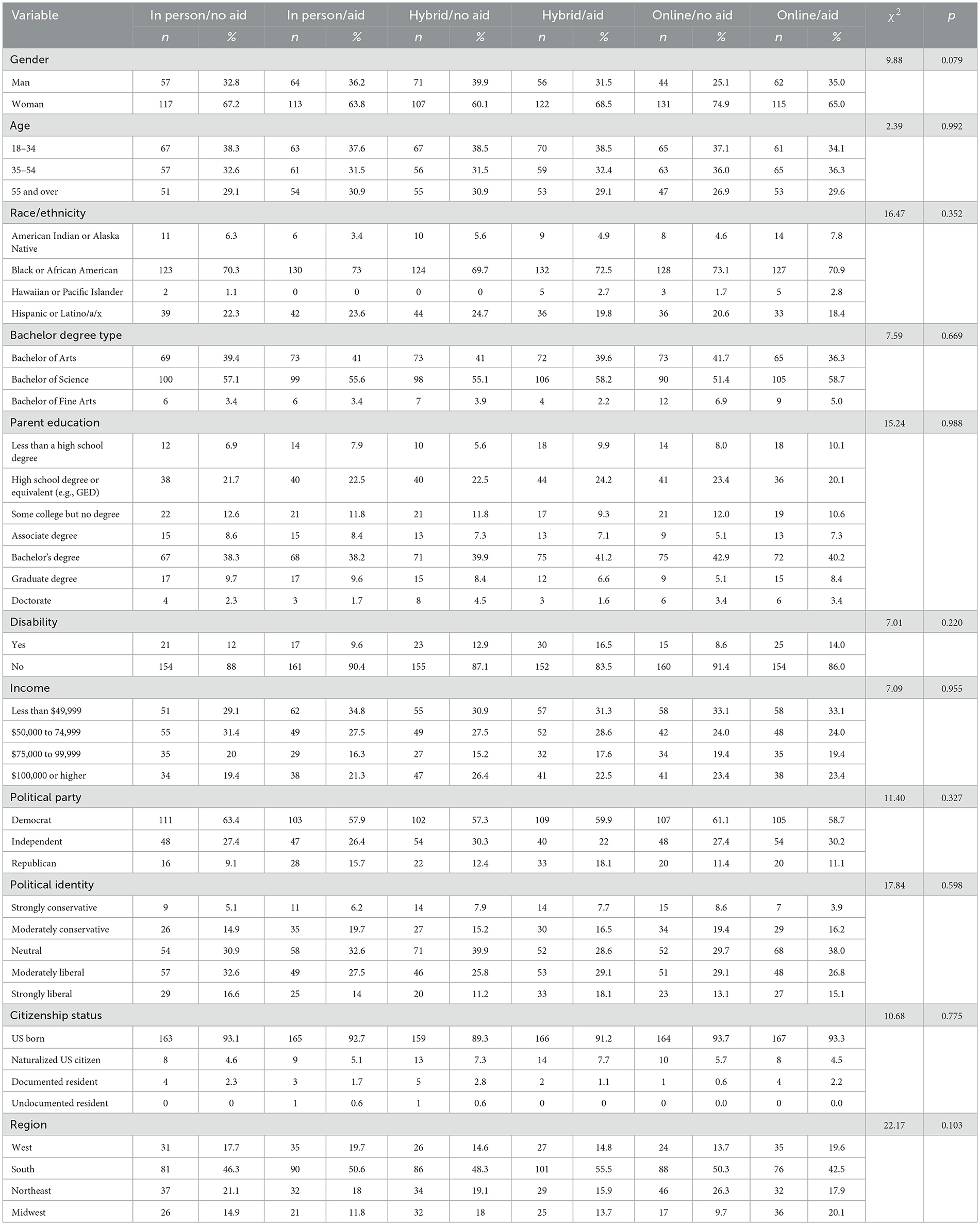 The balance tests were conducted and as discussed in Supplementary Appendix A, there were significant differences across the experimental conditions for gender with more women in the online/no aid group compared to the hybrid/no aid group. Due to the lack of significance of the omnibus tests, this covariate was not included in the primary analyses. No other differences existed across covariates.