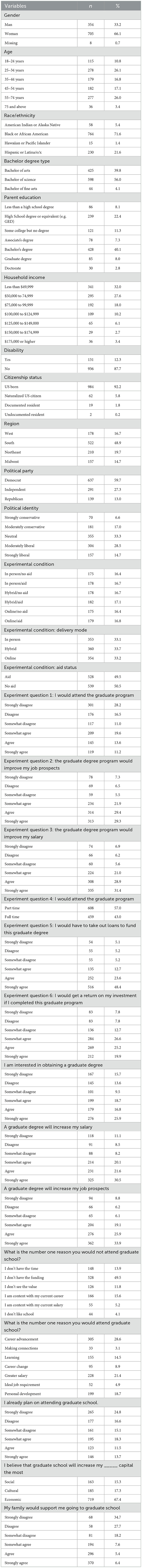 In a mixed factorial design delivered online via an aggregate survey platform, we manipulated graduate degrees (online vs. hybrid vs. in-person) and aid (no aid vs. aid) to test the extent to which both influenced the decision-making processes associated with attending a prospective graduate program at a local state university. See Table 1 for a breakdown of the experiment.