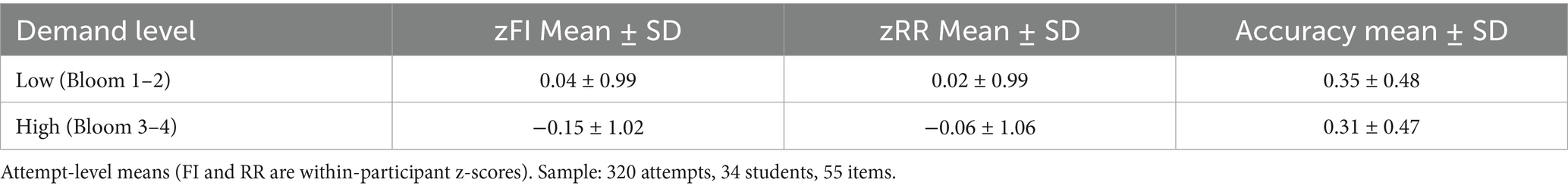 Descriptive statistics for attempt-level zFI, zRR, and accuracy by Bloom level appear in Table 1. Item-level length characteristics and Welch tests are provided in Supplementary Table S1.