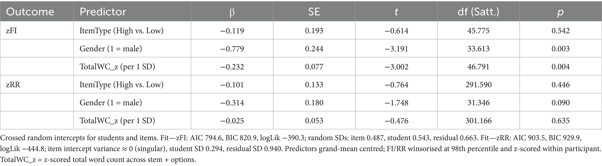 Two LMMs regressed zFI and zRR on Bloom demand (High vs. Low), Gender, and TotalWC_z, with crossed random intercepts for Student and Item. When FI and RR were modeled from Bloom demand with TotalWC and Gender as covariates (random intercepts for students and items), item length—not Bloom level—was the reliable predictor of FI. Longer/shorter items were associated with correspondingly lower/greater FI (TotalWC term, p = 0.004), and the nominal Bloom contrast no longer reached significance after this control. RR showed no detectable change by Bloom. Thus, in this authentic quiz bank, how much text students had to process mattered more for dwell time than whether the item targeted lower- or higher-order cognition. Full coefficients appear in Table 2.
