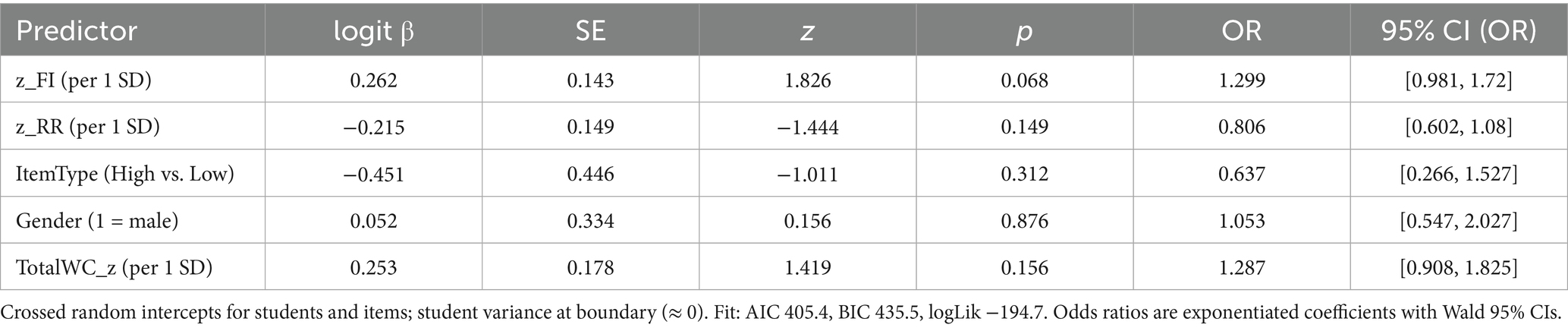 A logistic GLMM with crossed random intercepts (Student, Item) predicted accuracy from FI, RR, Bloom demand, and gender (Table 3).