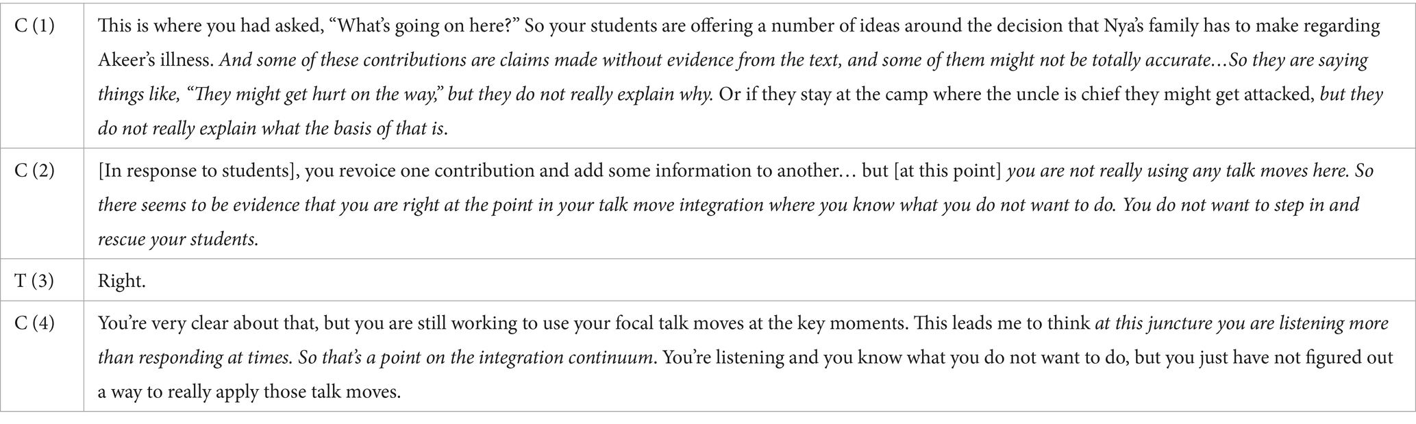 The discussion proceeds with the coach once again leveraging and extending the teacher’s comment, offering a slight pushback to her assertion (T17: But do not throw [your lesson plan] out the window…) in a way that also affirms the teacher’s initial ideas (T17: You do not want to start adding or deleting your questions, because your original lesson plan is powerful). This, in turn, prompts the teacher to refine her initial interpretation, offering a more sophisticated reframing of the issue in terms of a key learning principle (T18: It all ties back to that allowing the discussion to evolve and facilitating the discussion, rather than, quote/unquote, teaching and leading a lesson.) [Exploring generalizations]. Finally, the discussion concludes with the teacher offering a rich summative statement that links together alternative teaching moves, goals, and content across levels of generalization (T20: It’s a different way of looking at it. They’re still learning, but they are learning via discussion. Sometimes we learn as educators…we have to [know when to] clear those up, and know when to let it ride, like with the lion, with Marial being left. I mean we could have delved a lot further into that, but it really would not have gotten us anywhere, so knowing when to cut and say, “Okay, you guys, we’ll read more about this. Let us see if it changes our thinking once we have read a little bit further.”) [Exploring generalizations + Drawing conclusions].