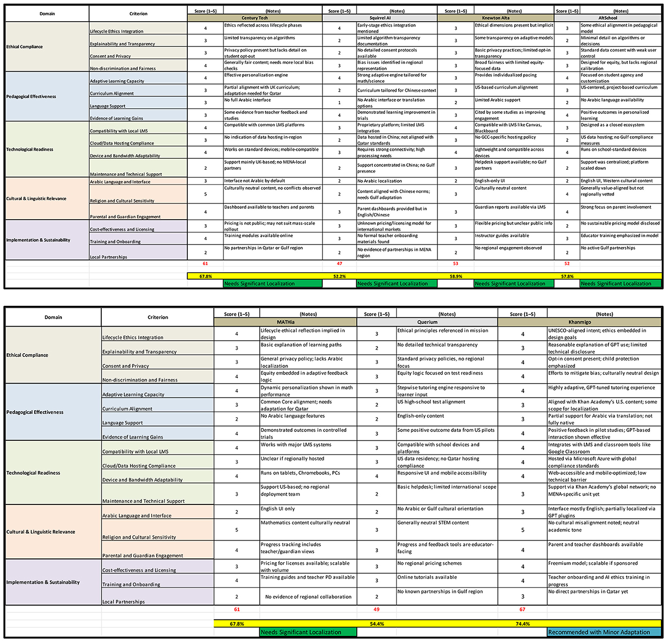 The application of this matrix to seven prominent platforms, Khanmigo, CENTURY Tech, MATHia, Knewton Alta, AltSchool, Querium, and Squirrel AI, revealed a diverse spectrum of ethical integration and deployment readiness. Notably, Khanmigo scored the highest at 74.4%, followed by CENTURY Tech and MATHia at 67.8% each. These tools demonstrated commendable performance in pedagogical effectiveness and user-facing adaptability but required targeted modifications for cultural, linguistic, and regulatory compliance. The remaining platforms, Knewton Alta (58.9%), AltSchool (57.8%), Querium (54.4%), and Squirrel AI (52.2%), were categorized as needing significant localization, particularly in the areas of Arabic language support, curriculum alignment, and data governance transparency.