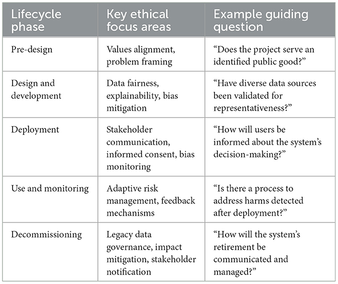 In the initial conception stage, the EIA tool emphasizes the importance of problem framing and values alignment. Stakeholders are encouraged to ask foundational questions, such as whether the intended use of AI genuinely serves public interest and whether alternative non-AI solutions have been adequately considered. Ethical reflection at this stage seeks to prevent the normalization of harmful objectives and ensure that human rights are embedded from the outset.