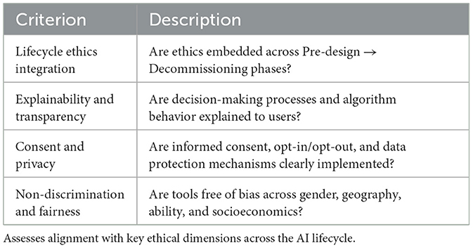Each AI tool is scored qualitatively across these stages, and comparative insights are drawn to identify best practices, ethical gaps, and areas for policy intervention.
