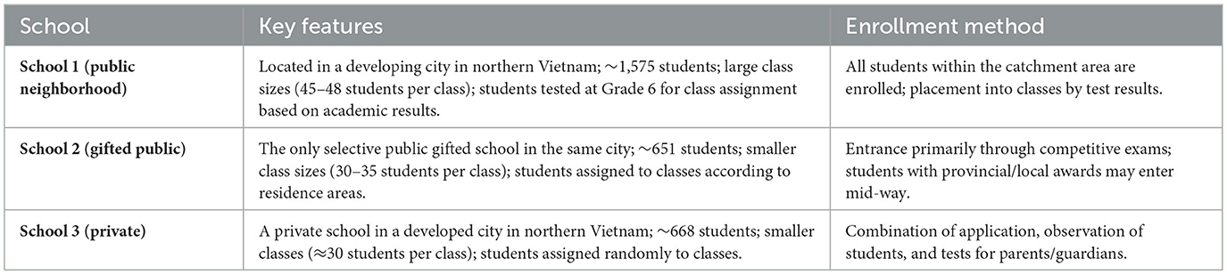 A purposive maximum-variation sampling strategy was used to ensure diversity (gender, academic competence, involvement in extracurricular activities) across institutional type (Patton, 2015). Data were collected in Vietnam from three secondary schools representing different institutional types: School 1—Public neighborhood school (large class sizes, traditional exam orientation), School 2—Gifted public school (selective admission, academic competition focus), School 3—Private school (smaller classes, progressive pedagogy). All schools had implemented the 2018 GEP and used Vietnamese as the primary language of instruction. Key contextual features—including assessment policies, surveillance practices (e.g., CCTV), and student governance structures—varied across sites, providing a basis for cross-case comparison.