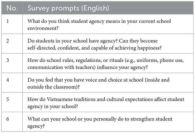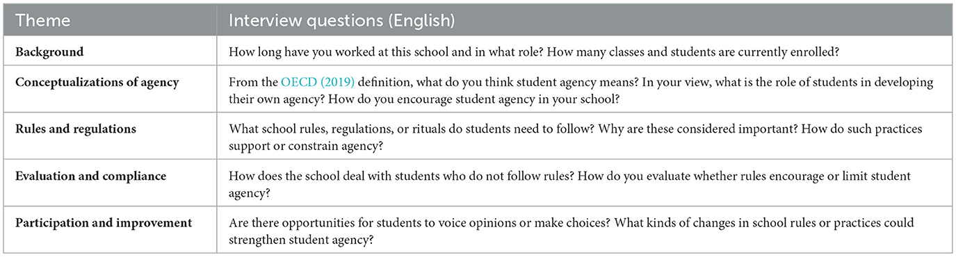 The interviews, conducted with five school leaders across three different secondary schools, lasted between 60 and 75 min. They were carried out in Vietnamese, audio-recorded with consent, transcribed verbatim, and later translated into English for analysis. The interview protocol was developed based on theoretical frameworks of student agency (OECD, 2019; Jääskelä et al., 2021) and included guiding questions about how leaders conceptualized agency, how rules and practices shaped students' autonomy, and what opportunities or constraints existed in their schools. The full interview protocol is provided in Table 2. One principal had to respond to the interview questions through email.