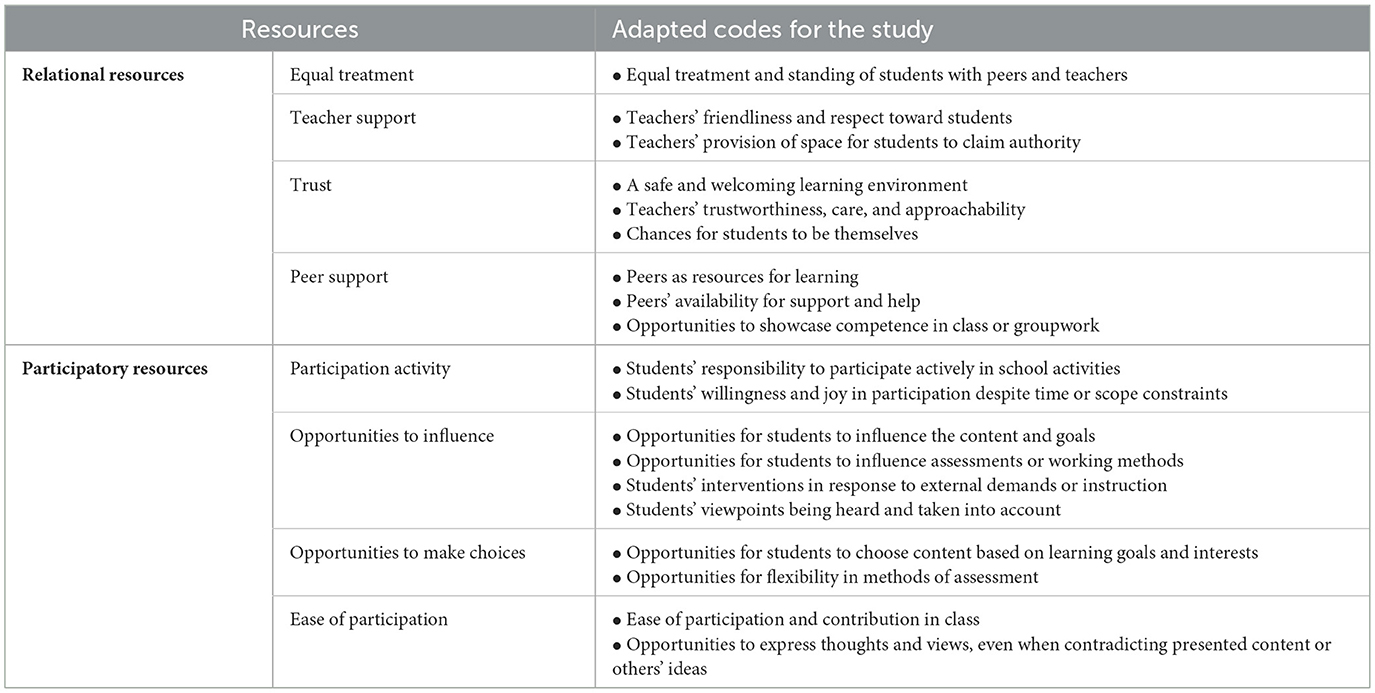 The original target of the Agency of University Students (AUS) scale (Jääskelä et al., 2021) was university students at the course level, so it was adapted for use in this study of Vietnamese secondary schools. The original questionnaire items were transformed into codes that then served as an analytic frame for qualitative data. The adaptation followed several steps. First, items representing individual resources (competence beliefs, self-efficacy beliefs, interest, and utility beliefs) were omitted, since the focus of Research Question 2 was on relational and participatory dimensions of agency. Second, all reverse-coded items were recast in a positive direction. Third, items that referred narrowly to course-level practices were reworded to capture the expansiveness of schooling experiences (e.g., the phrase “the course” was replaced with “school experiences” or “learning experiences”). Finally, in some cases multiple items were combined into a single code to avoid redundancy - for instance, items 1, 2, and 3 were merged into the adapted code “Students take responsibility to participate actively in school activities”. The resulting coding frame emphasized relational and participatory resources and is presented in Table 4.