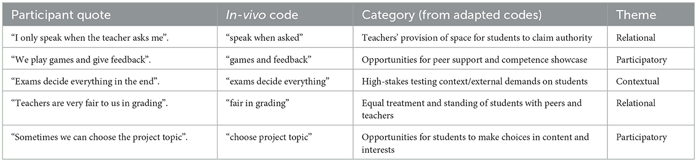 This adapted frame then guided a thematic analysis (Braun and Clarke, 2006) conducted in three iterative cycles using MAXQDA software. All interview transcripts and student survey responses were anonymized before analysis. In the first cycle, in-vivo coding was applied line by line to capture participants' own words; for example, phrases such as “being confident to speak up” or “just following rules” were tagged as initial codes (RQ1). In the second cycle, these descriptive codes were reorganized through axial coding and aligned with the adapted categories in Table 4, such as “teachers' provision of space for students to claim authority,” “peer collaboration,” or “exam pressure” (RQ2 and RQ3). In the third cycle, matrix coding queries were conducted to compare how categories appeared across school types (public, private, gifted) and participant roles (students, school leaders). For instance, all codes relating to “voice” were cross-tabulated by school type to reveal convergences and divergences. To avoid over-reliance on software outputs, coded segments were manually cross-checked against the original transcripts and survey responses to ensure that the analysis reflected the substance of participants' accounts rather than researcher assumptions. Table 5 illustrates this analytic trajectory, showing how raw excerpts were developed into in-vivo codes, adapted categories, and overarching themes. Trustworthiness was established through multiple strategies: member checking with two school leaders and six students across different schools, negative case analysis to test emerging interpretations, and maintenance of an audit trail of coding decisions and analytic memos to ensure transparency and dependability.