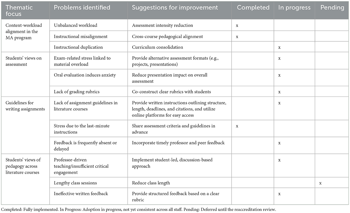 Despite uncertainties regarding their qualifications to suggest changes in the curriculum and concerns about potential repercussions, participants expressed a strong belief that their recommendations would be given serious consideration and changes would eventually occur in the curriculum. This belief was supported by active faculty involvement during the co-construction, but also by early indications that changes were underway. As pointed out by one of the participants who was in contact with MA students from the subsequent cohort, their recommendations had been taken into account. In one's words, “I've noticed in a way that the professors actually took notes from what, at least what our interviewees mentioned in their interviews. So, I do believe they started to quite modify and change the program” (S1, I/2). Another participant (S3, I/2) conveyed assurance that their suggestions were impactful, noting that some faculty “actually cared, you know, to see some changes in the department” and also were sincerely invested “to put this idea forward so that the department gets improved”. On the same note, S4, I/2 pointed out that by witnessing the genuine enthusiasm of faculty members and observable signs of progress “I could see the interest of professors to to actually improve the improve the entire department so I think that now it has changed a bit”. Participants conveyed a shared conviction that their contribution would lead toward meaningful changes in the curriculum, shaping hence the learning experiences of future cohorts in the department, “even though it's not directly benefiting us” (S4, I/1).