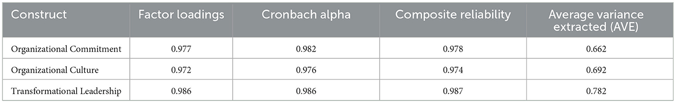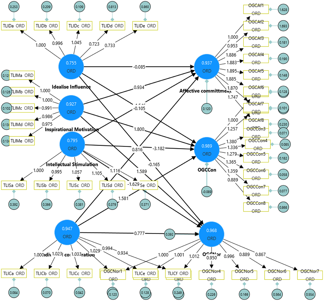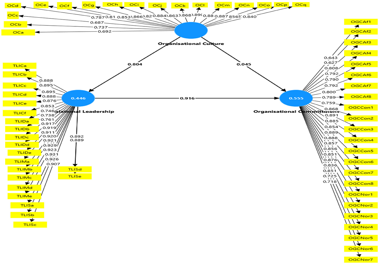 The strong positive relationship between organizational culture and transformational leadership (β = 0.668) indicates that a supportive culture enhances the adoption and practice of transformational leadership behaviors. In turn, transformational leadership exerts a robust and direct influence on organizational commitment (β = 0.858), reinforcing earlier findings that transformational leaders play a vital role in strengthening staff commitment.