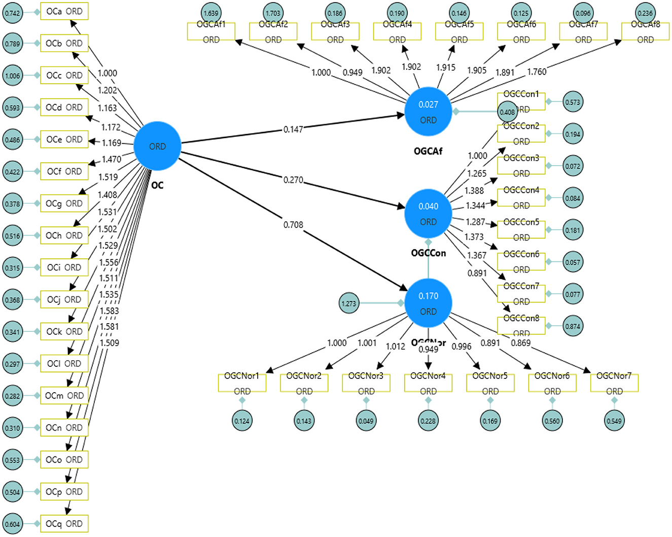 The strongest effect was observed between organizational culture and normative commitment (β = 0.708, t = 7.455, p = 0.000), demonstrating a very strong and statistically significant relationship.