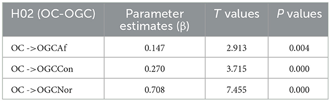 Hypothesis H02, which posited that innovative organizational culture significantly influences all three dimensions of organizational commitment among teachers in Oman's basic education schools, was supported by the study findings. This positive correlation between the two variables is consistent with earlier research (Golden III and Shriner, 2019; Ghumiem et al., 2023), which highlights the critical role of organizational culture in shaping employee commitment. Notably, a strong relationship was observed between organizational culture and normative commitment (β = 0.708), indicating that culture strongly fosters a sense of moral obligation and organizational citizenship behavior among educators—essential components of employee commitment.