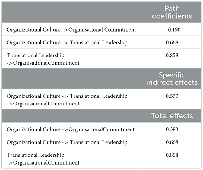 The path coefficients show that organizational culture has a weak direct negative effect on organizational commitment (β = −0.190), but the total effect remains positive (β = 0.383), suggesting that its overall influence on commitment operates mainly through an indirect pathway.