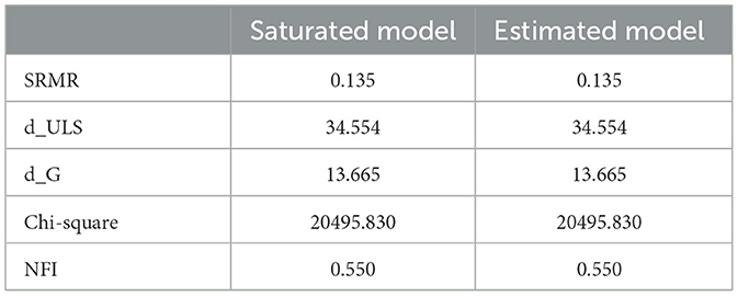 Model fit indices indicate an acceptable fit given the complexity of the mediation model. χ2 = 20,495.830 (p < 0.001), SRMR = 0.135, NFI = 0.550, d_ULS = 34.554, d_G = 13.665. The model demonstrated an acceptable fit considering the complexity and large sample size.