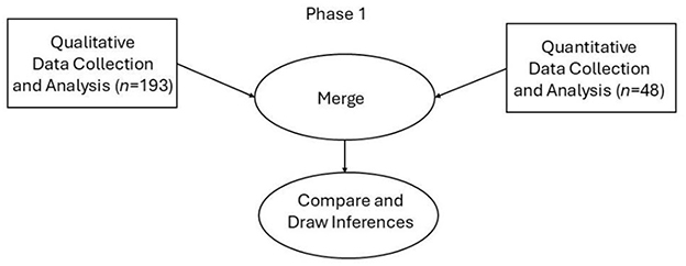 This study utilized a mixed convergent method (Figure 1) integrated quantitative and qualitative data to provide a more comprehensive understanding of the phenomenon under study (Creswell, 2022). In this non-experimental design, data were collected cross-sectionally, analyzed separately2 and then compared and integrated. The first quantitative phase was correlational and comparative in scope, while the second qualitative phase was exploratory and descriptive. The quantitative and qualitative data were combined to determine whether they converged or diverged. From this mixed analysis, conclusions were drawn from the data. Ramli and Yahya (2025) argue that the mixed-methods approach is beneficial for capturing multiple perspectives at a single point in time, enabling the research team to generate meta-inferences that enhance the understanding of the problem in the education field within Spanish-speaking contexts.