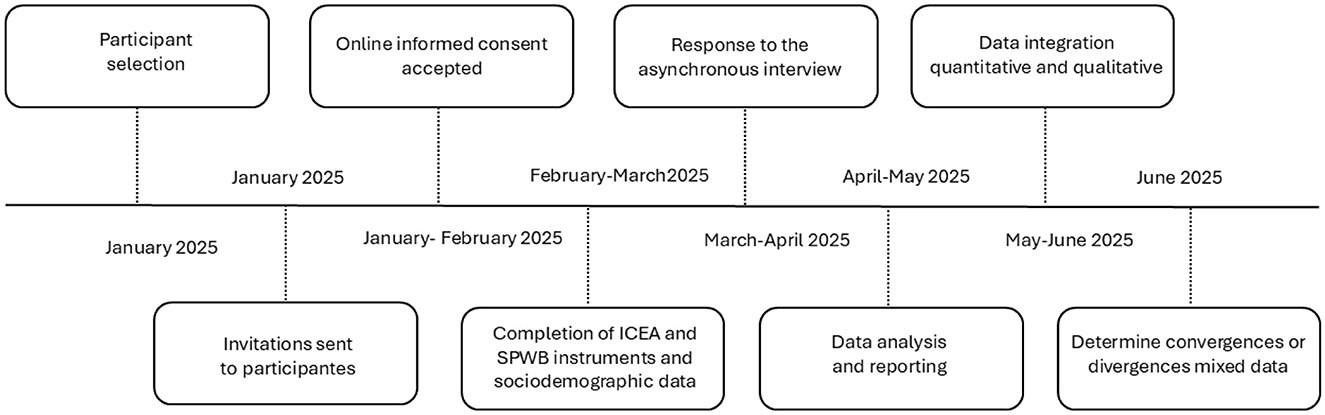 The data collection was carried out between January and June 2025 (Figure 2). The procedure involved contacting education professionals enrolled in continuing education programs focused on emotional education, coexistence, or school well-being in Chile by email. To ensure that the sample met these criteria, the research team sent invitations to participate in the study to four postgraduate and post-degree programs at two private and two public universities in Chile. Participants accepted the informed consent form online and downloaded a digital copy. Participants registered their information and completed the instruments ICEA, SPWB, and sociodemographic variable in an average time of 15 min and at the time that each participant considered convenient. This first form included a link to complete the asynchronous interview. A smaller sample agreed to complete the asynchronous interview, which took an average of 20 min. Both forms were open for a period of 2 months. The research team reiterated the invitation to participate in the study via two emails to participants. Quantitative and qualitative data were collected and analyzed separately. The quantitative and qualitative databases were merged or combined. Once the results were merged, a comparison of both datasets was made to determine whether they converged or diverged. From this comparison, the research team drew interpretations or conclusions by merging the two databases.