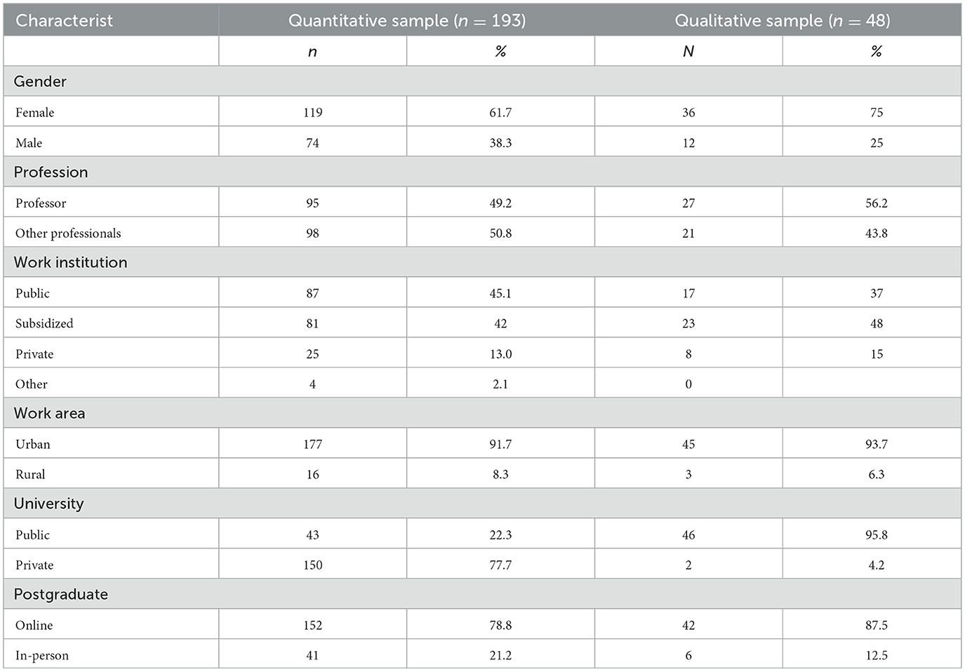 The qualitative sample consisted of 48 education professionals. Of these, 36 were women and 12 were men. The average age of the participants was 39.3 years (SD = 8.18), with a minimum age of 25 and a maximum of 57. The majority were teachers (52.6%) in school education. Nineteen participants resided and worked in the Metropolitan Region, and the remaining participants resided in different regions of Chile. Participants worked primarily in subsidized educational institutions (48%) located in urban areas (93.7%). Regarding continuing education, the majority studied at private universities (4.2%), with a strong preference for online graduate programs (87.5%) (Table 1).