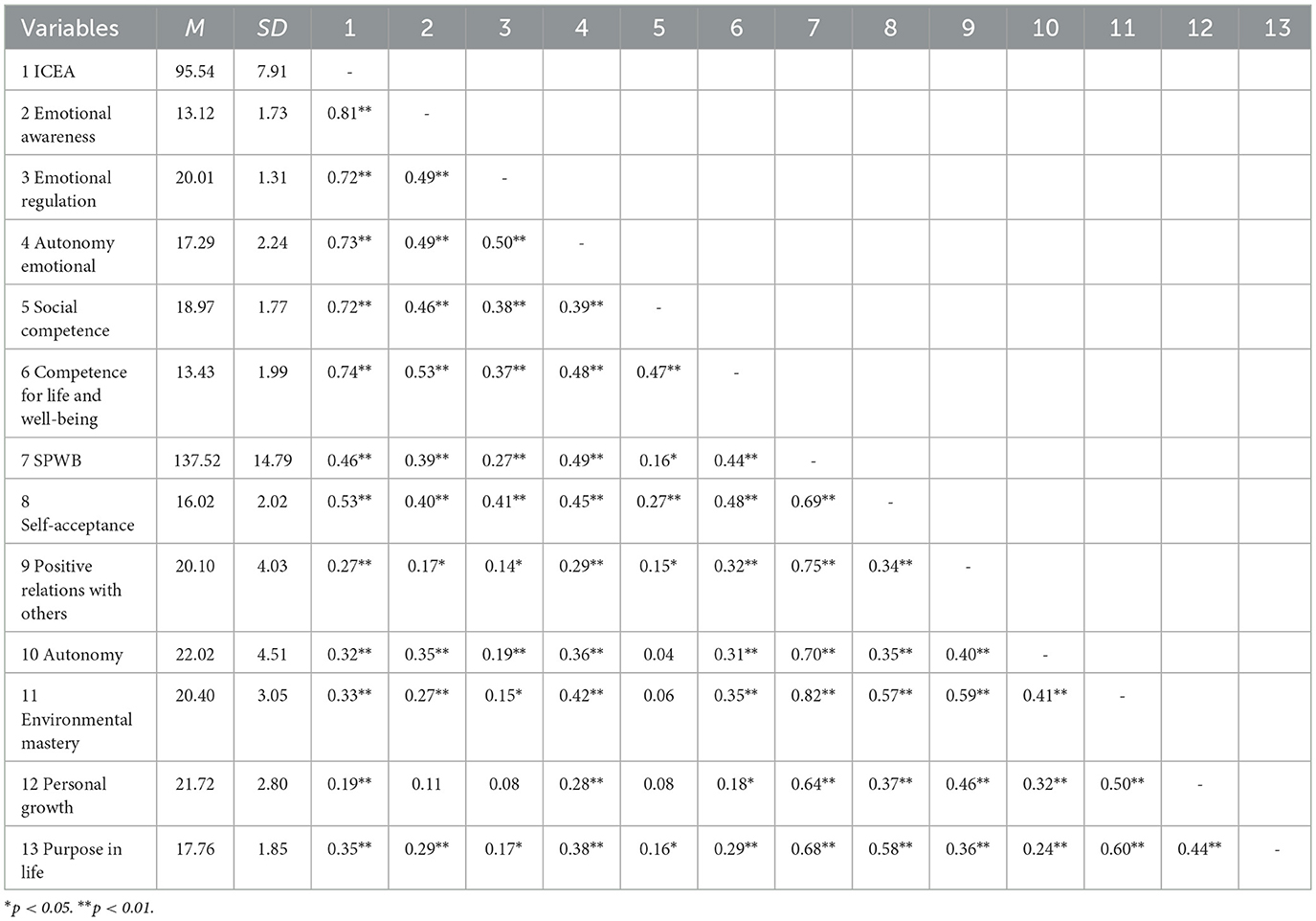 Table 2 also presents Pearson's bivariate correlations among various scales and dimensions. The total ICEA score correlated positively and significantly, with moderate to high strength, across all dimensions of emotional competencies. The highest correlation was observed between autonomy and emotional regulation (r = 0.50**, p = 01), while the lowest occurred between competence for life and well-being and emotional regulation (r = 37**, p = 01). SPWB also correlated positively and significantly, with moderate to high strength, among all dimensions of psychological well-being. Environmental mastery and purpose in life (r = 60**, p = 01) exhibited the highest correlation among the dimensions, whereas autonomy and purpose in life (r = 24**, p = 01) showed the lowest.