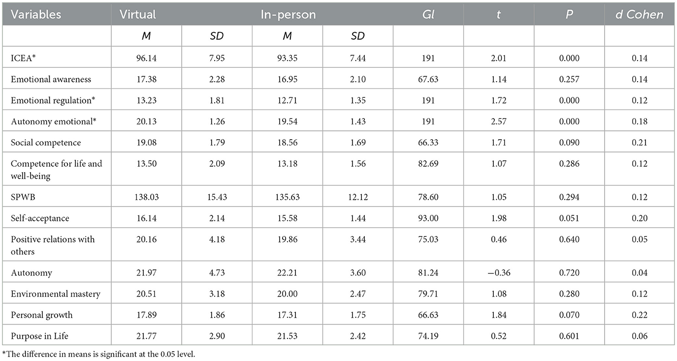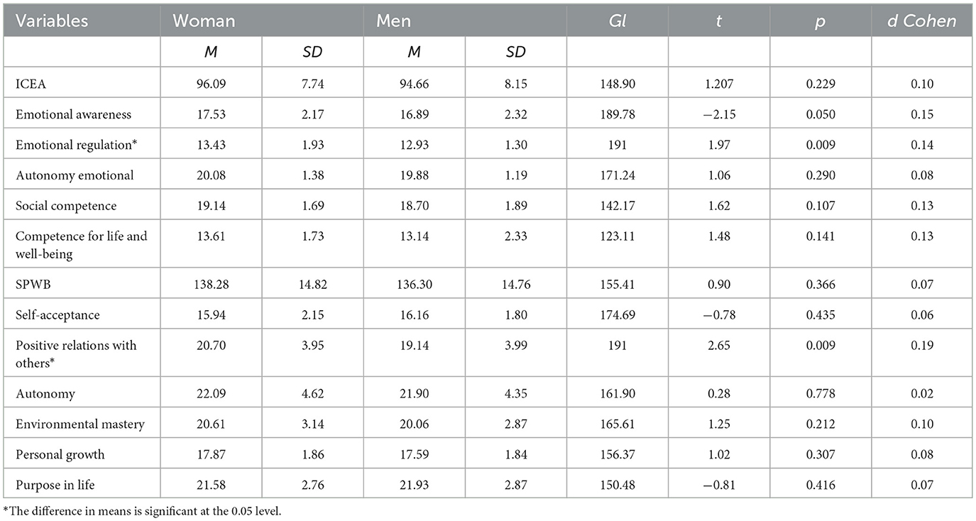 An independent sample t-test was conducted to identify statistically significant differences between men and women in ICEA and SPWB scores, as well as their dimensions (Table 3). Previously, Kolmogorov–Smirnov was calculated, whose n p-value > 0.05 suggests that there is no statistically significant evidence against normality, so a normal distribution is assumed. Levene's test was also performed to assess homogeneity of variance. The effect-size is reported as Cohen's d and its confidence interval (CI) is at 95%. The results did not indicate statistically significant differences in overall ICEA scores, t(191) = 1.22, p = 0.223. However, a notable difference was found in the emotional regulation dimension, t(189.79) = 2.16, p = 0.000, with the women's group achieving a higher average score than the men.