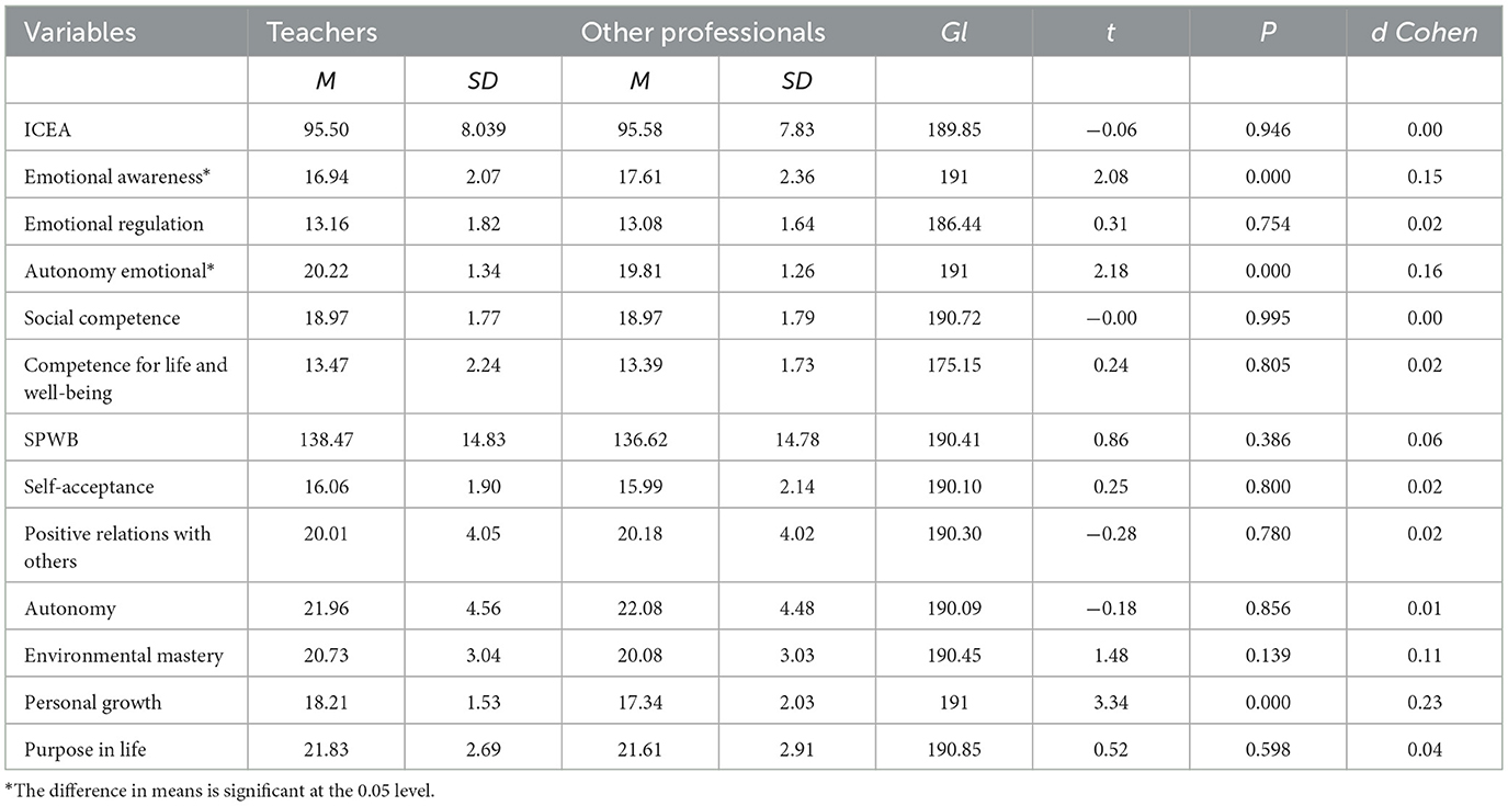 Table 4 indicates a significant difference in the emotional awareness dimension for the profession variable [t(≈191) = −2.08, p = 0.000]. Other educational science professionals had a higher (M = 17.61, SD = 2.36) compared to teachers (M = 16.94, SD = 2.07). For the emotional autonomy dimension, teachers scored significantly higher than other educational science professionals [t(191) = 2.18, p = 0.000], with a mean of 20.22 (SD = 1.34) compared to 19.81 (SD = 1.26). A significant difference was also found in the personal growth dimension of psychological well-being, favoring teachers [t(≈191) = 3.34, p = 0.000].