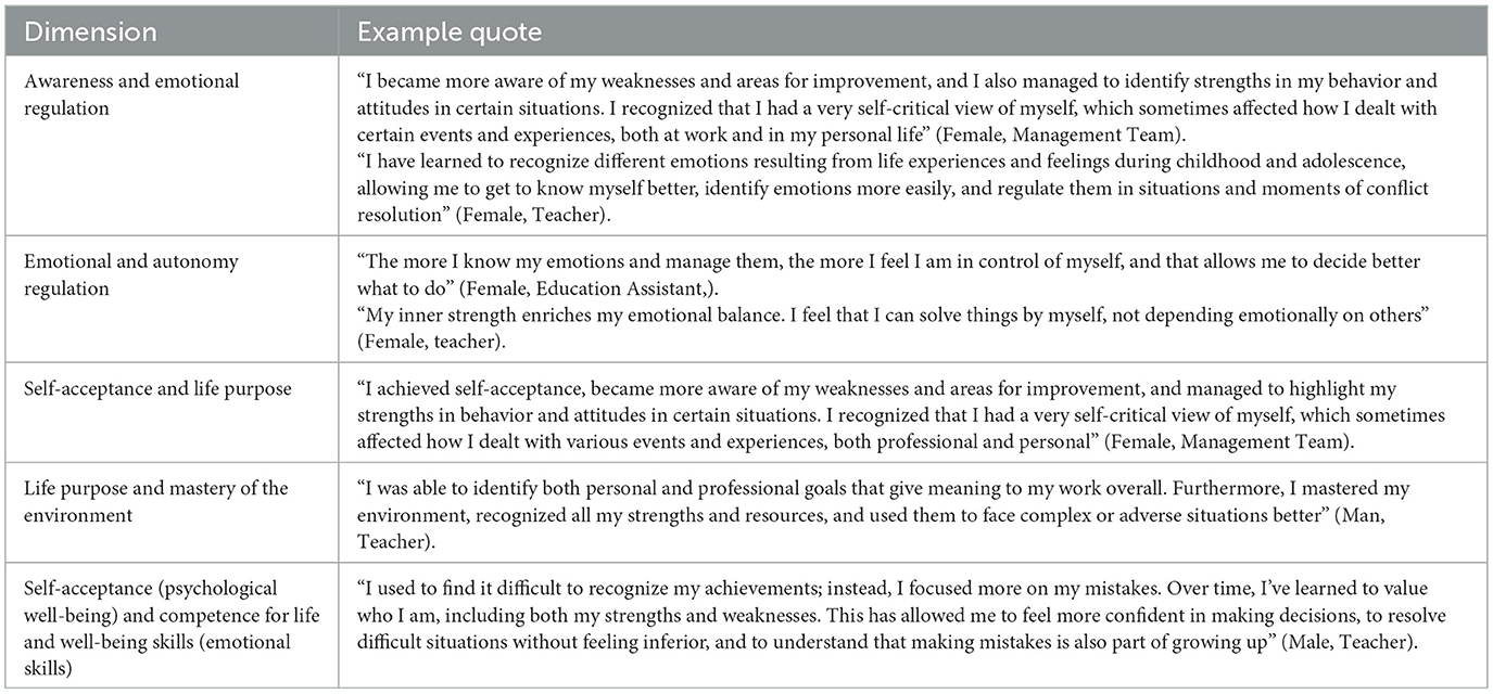 The qualitative data analysis revealed similarities with the results of the quantitative analyses, particularly in the relationship between the dimensions of emotional competencies, the dimensions of psychological well-being, and the dimensions of both constructs. These relationships are presented in Table 6, accompanied by examples of participants' quotes.