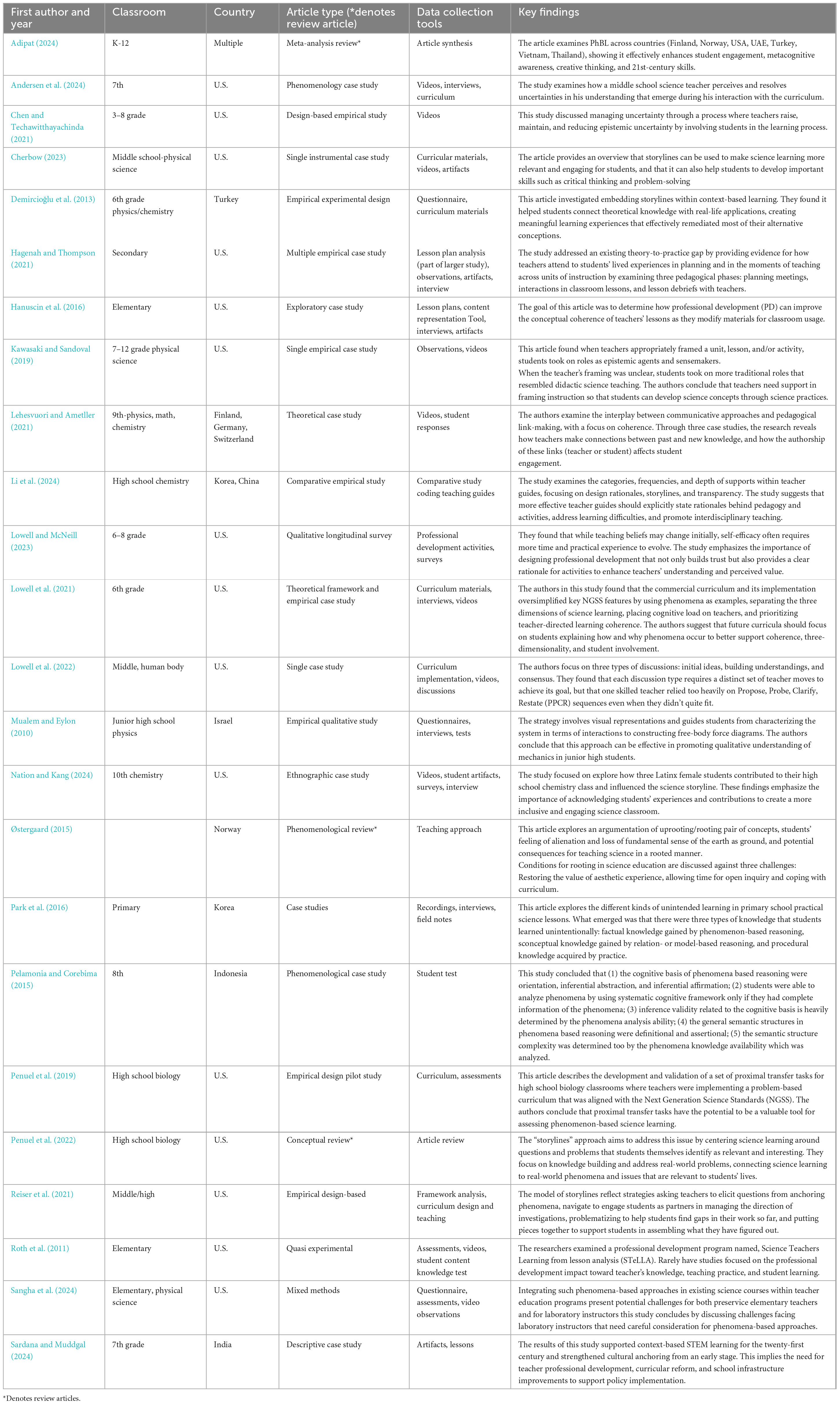 Our systematic review of phenomenon-based learning (PhBL) and storyline approaches revealed research spanning diverse educational contexts and methodological approaches. The 24 qualitative articles analyzed (see Table 1) represent scholarship from nine countries, demonstrating global interest in these pedagogical approaches. Two articles prior to the timeframe of 2013 were included due to their specific PhBL examples identified.