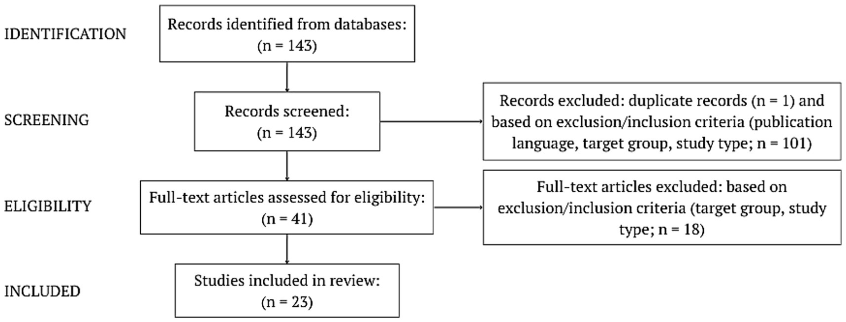 The study selection followed a three-step process: (1) database search and removal of duplicates; (2) title and abstract screening based on inclusion/exclusion criteria by two independent reviewers; and (3) full-text review by two independent reviewers and resolution of discrepancies through discussion. The first step of the search process was conducted using EBSCOhost, accessing the following databases: Academic Search Complete, APA PsycArticles, APA PsycInfo, ERIC, SocINDEX with Full Text and MEDLINE. Automation tools were used for duplicate removal. A total of 143 articles were identified. In the second step, to prevent potential bias in the selection process, two independent reviewers screened the abstracts of all identified articles to assess their relevance according to the predefined criteria (see Table 1). In cases where there was a disagreement on inclusion or exclusion, a discussion was held to reach a consensus on whether the article should proceed to a full-text review. After this process, 101 articles were deemed ineligible, and 1 duplicate was removed, resulting in 102 articles being excluded. Following the initial screening, 41 articles proceeded to full-text review. After the full-text review, again done by two independent reviewers, 23 articles were retained for the final analysis (see reasons for exclusion in Figure 1). Any doubtful cases were resolved through discussion. The study selection process can be seen in Figure 1.