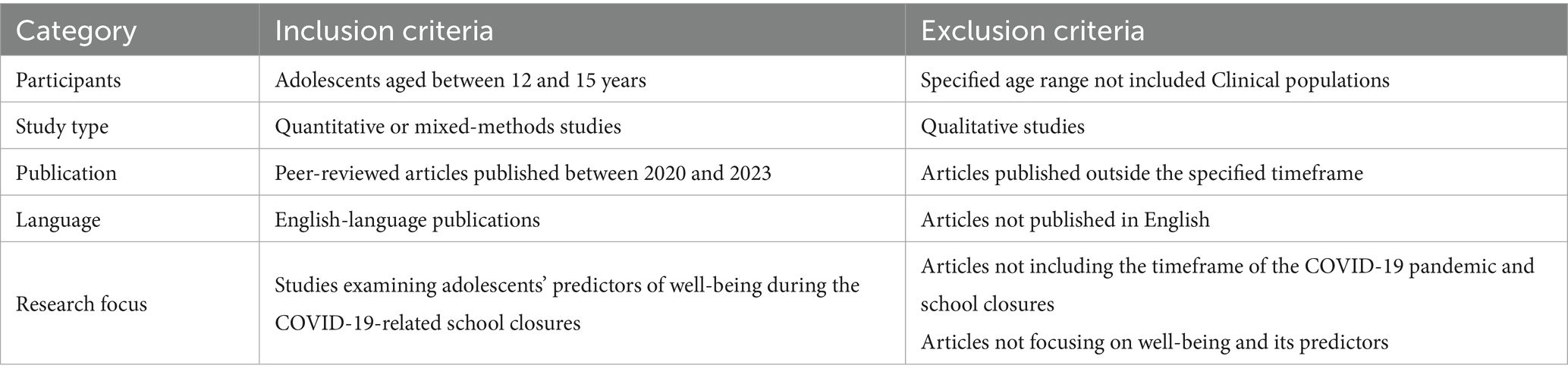 The systematic review followed predefined inclusion and exclusion criteria to ensure consistency and relevance. Studies were included if they met the criteria outlined in Table 1. Eligible studies focused on adolescents aged 12 to 15 years, as this group is considered particularly vulnerable (e.g., Michel et al., 2009; Towner et al., 2023; Yoon et al., 2023) and employed quantitative or mixed-methods approaches. In mixed-methods studies, only the quantitative analysis results were considered for inclusion. Only peer-reviewed articles published in English between 2020 and 2023 were included. Studies had to examine predictors of adolescent well-being during COVID-19-related school closures. Studies were excluded if they involved participants outside the specified age range, included clinical populations, relied solely on qualitative methods, were not published in English, or did not focus on predictors of well-being during pandemic-related school closures.
