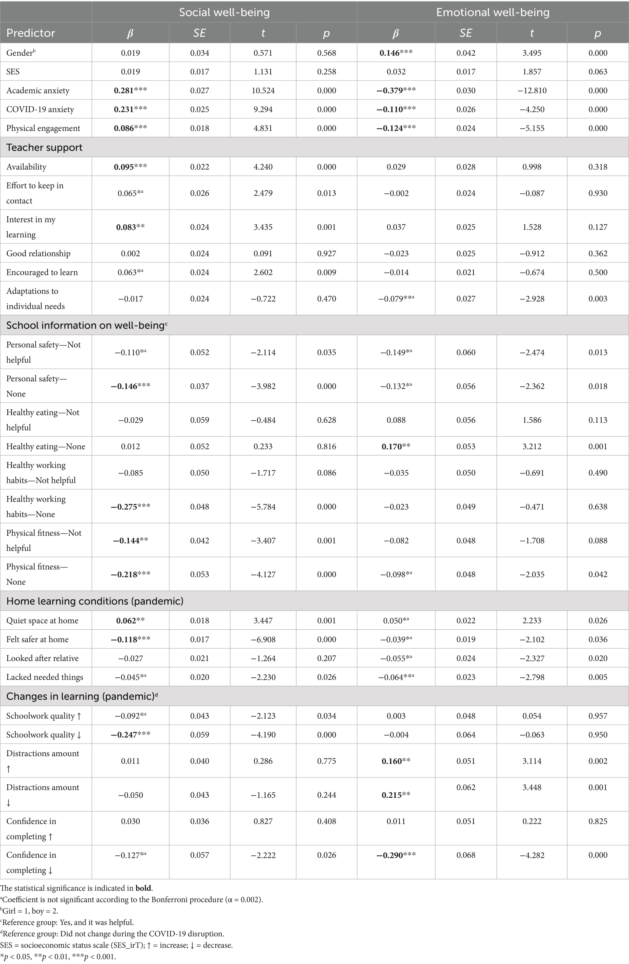 Two regression models were done separately for social and emotional well-being (see Table 2). The regression model significantly predicted both social well-being, R2 = 0.44, SE = 0.02, Wald F(29, 46) = 49.42, p < 0.001, and emotional well-being, R2 = 0.33, SE = 0.02, Wald F(29, 46) = 38.22, p < 0.001, showing that the included predictors accounted for a substantial proportion of variance in students’ well-being during the COVID-19 disruption. Due to the large number of predictors included in the regression analysis, the Bonferroni correction was applied to control for type I error by adjusting the significance level for multiple comparisons, calculated by dividing the alpha level by the number of tests performed (αBonf = α/n, resulting in αBonf = 0.002).