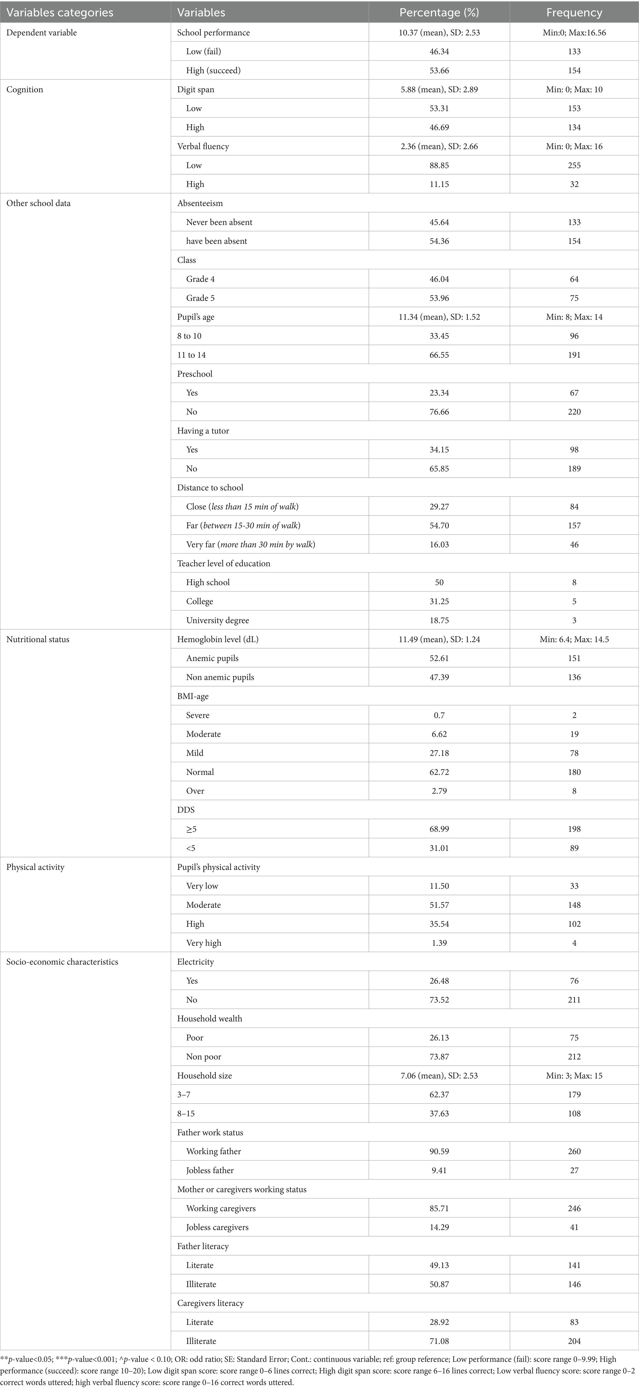 All statistical analyses were performed using Stata version 18.0. The data analysis involved a three-stage approach (univariate, bivariate, and multivariate). The univariate approach examined the descriptive statistics to understand characteristics and distribution of each variable before conducting further analysis. It provided valuable insights into the individual variables, which helped identify outliers, understand the central tendency, and assess the overall shape of the data distribution. We used binary logistic regression model in the second and third stages since the dependent variable (pupil’s school performance) is binary. This allowed us to investigate the association between school performance and independent variables (Hedeker et al., 2000). The second stage involved bivariate ordered logistic regression to understand the relationship between school performance and each independent variable. This helped assess each variable’s impact on the likelihood of passing or failing at school. The final stage involved investigating the association of the combined independent variables and their impact on the dependent variable (Hedeker et al., 2000). We used a likelihood estimation method to calculate the odds ratios for pupils having low school performance (Murad et al., 2003). The odds ratios exceeding one (OR>1) indicate a higher likelihood of low school performance, while those below one (OR<1) demonstrate a lower likelihood. Statistical significance was set at p < 0.05. The reliability of the model was assessed using R-squared, the Akaike Information Criterion (AIC), and the Bayesian Information Criterion (BIC).