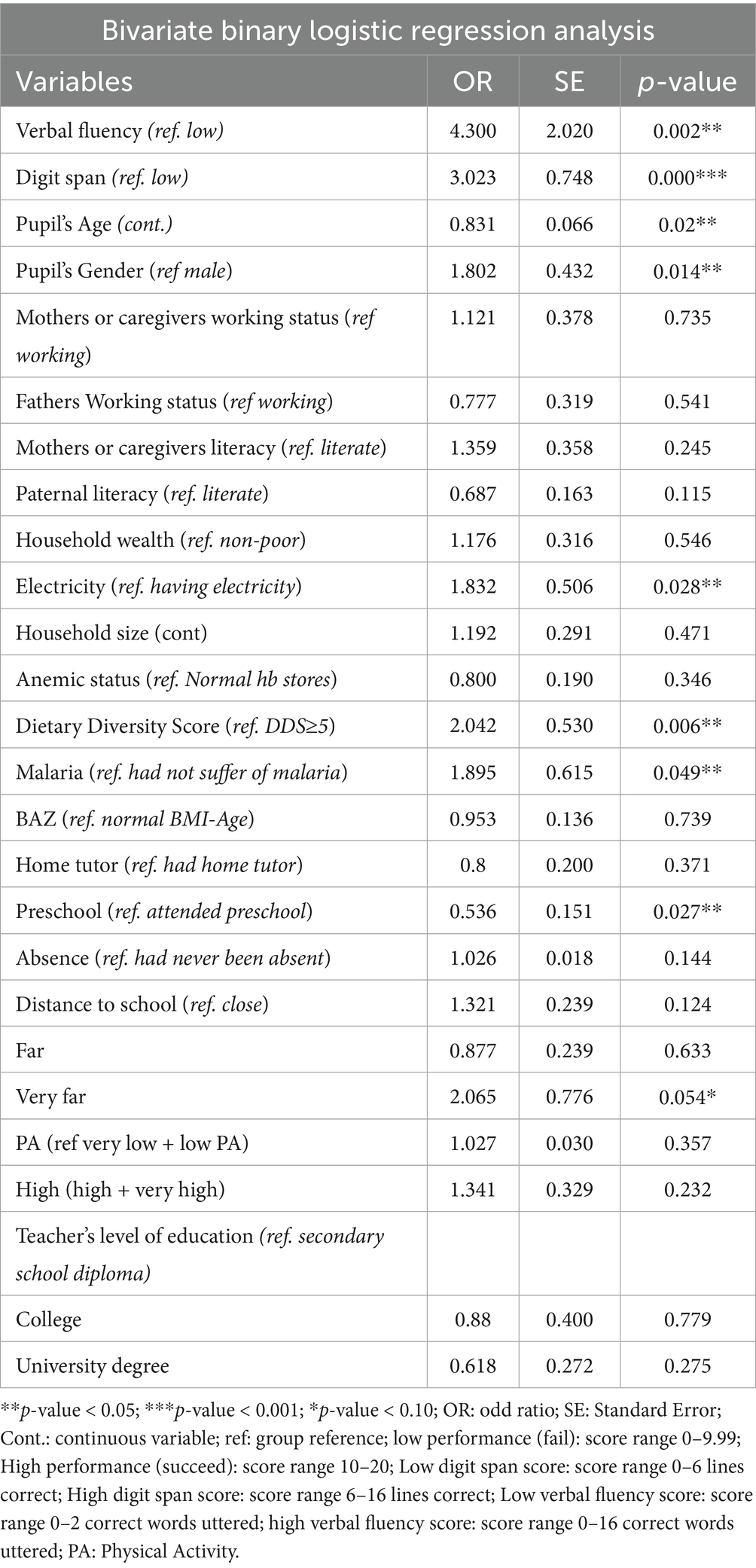 Table 2 shows the results of the bivariate binary logistic regression analysis. The findings showed that verbal fluency (OR = 4.300, p < 0.05) and digit span (OR = 3.023, p < 0.001) impacted significantly school achievements, with pupils showing lower scores being at least three time more likely to score low school performance. In addition, an increase in age (OR = 0.831, p < 0.05) reduced the odds of having low academic performance. Female pupils were significantly more likely to perform lower than their male counterparts (OR = 1.802, p < 0.05). Lack of electricity were a negative factor for academic performance, as pupils from households without electricity were nearly two time more likely to perform lower in school (OR = 1.832, p < 0.05). Pupils’ not having a minimum dietary diversity were two time likely to fail at school (OR = 2.042, p < 0.05). In the same line, having suffered from malaria in the considered term (OR = 1.895, p < 0.05), were positively associated with low performance. Lacking preschool program (OR = 1.895, p < 0.05) negatively impacted outcomes. The relationship between distance to school and performance was inconclusive, although pupils living very far (OR = 2.065, p < 0.05) from school approached significance for poorer performance.