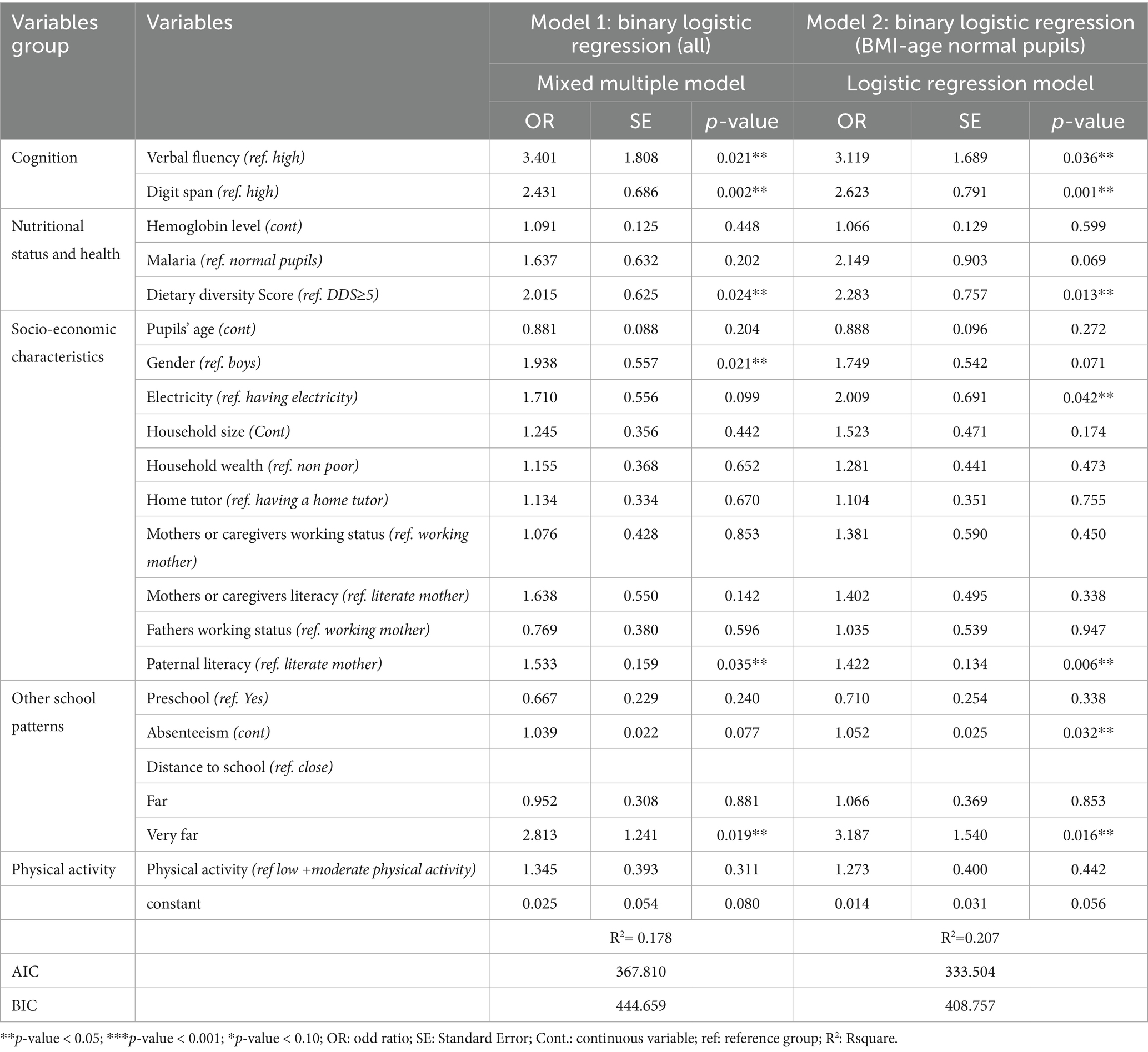 Among pupils with normal BMI for their age, similar patterns were observed, though with some variations. Cognitive performance in verbal fluency (OR = 3.119, p < 0.05) and digit span (OR = 2.623, p < 0.05) continued to be significant predictors. Food diversity remained a significant protective factor for academic performance (OR = 2.283, p < 0.05), reinforcing the importance of dietary diversity in supporting cognitive and academic outcomes. Socio-economic and demographic variables such as access to electricity (OR = 2.009, p < 0.05) showed similar trends as in the full model, with electricity access being a significant factor. Gender exhibited no effect. Paternal literacy continued to be protective (OR = 1.422, p < 0.05), highlighting the role of parental education in shaping academic success. School-related factors such as school absence (OR = 1.052, p < 0.05) were significantly associated with low performance, revealing the importance of regular school attendance. Additionally, considerable long distance to school (OR = 3.187, p < 0.05) was found to increase the risk of academic underachievement.