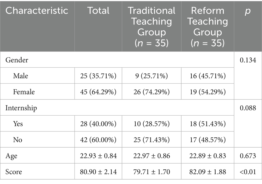 Following distribution of 72 questionnaires, 70 responses met inclusion criteria after exclusion of incomplete or inconsistent entries, establishing a validity rate of 97.22%. Participants comprised postgraduate students who had completed the Environment and Health course. The cohort (mean age = 22.93 ± 0.84 years) consisted of 64.29% females and 35.71% males, with 40.00% possessing internship experience. Academic performance analysis revealed significantly higher scores (p < 0.05) in the Reform Teaching Group (82.09 ± 1.88) versus the Traditional Teaching Group (79.71 ± 1.70), with an overall mean score of 80.90 ± 2.14 (Table 1).