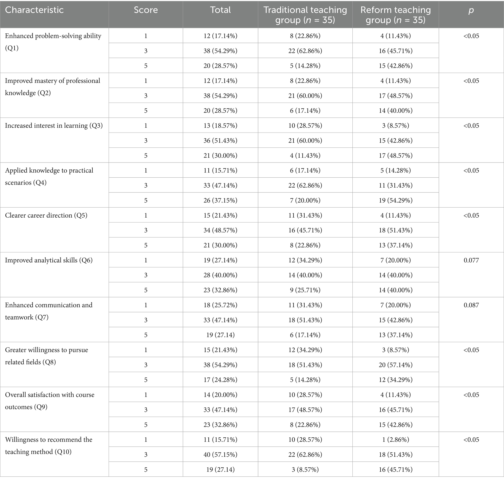 The results indicated that, between the two groups, statistically significant differences were observed in the following items: “Enhanced problem-solving ability (Q1),” “Improved mastery of professional knowledge (Q2),” “Increased interest in learning (Q3),” “Applied knowledge to practical scenarios (Q4),” “Clearer career direction (Q5),” “Greater willingness to pursue related fields (Q8),” “Overall satisfaction with course outcomes (Q9),” and “Willingness to recommend the teaching method (Q10)” (p < 0.05). In contrast, “Improved analytical skills (Q6)” and “Enhanced communication and teamwork (Q7)” showed no statistically significant differences (p > 0.05) (Table 2).