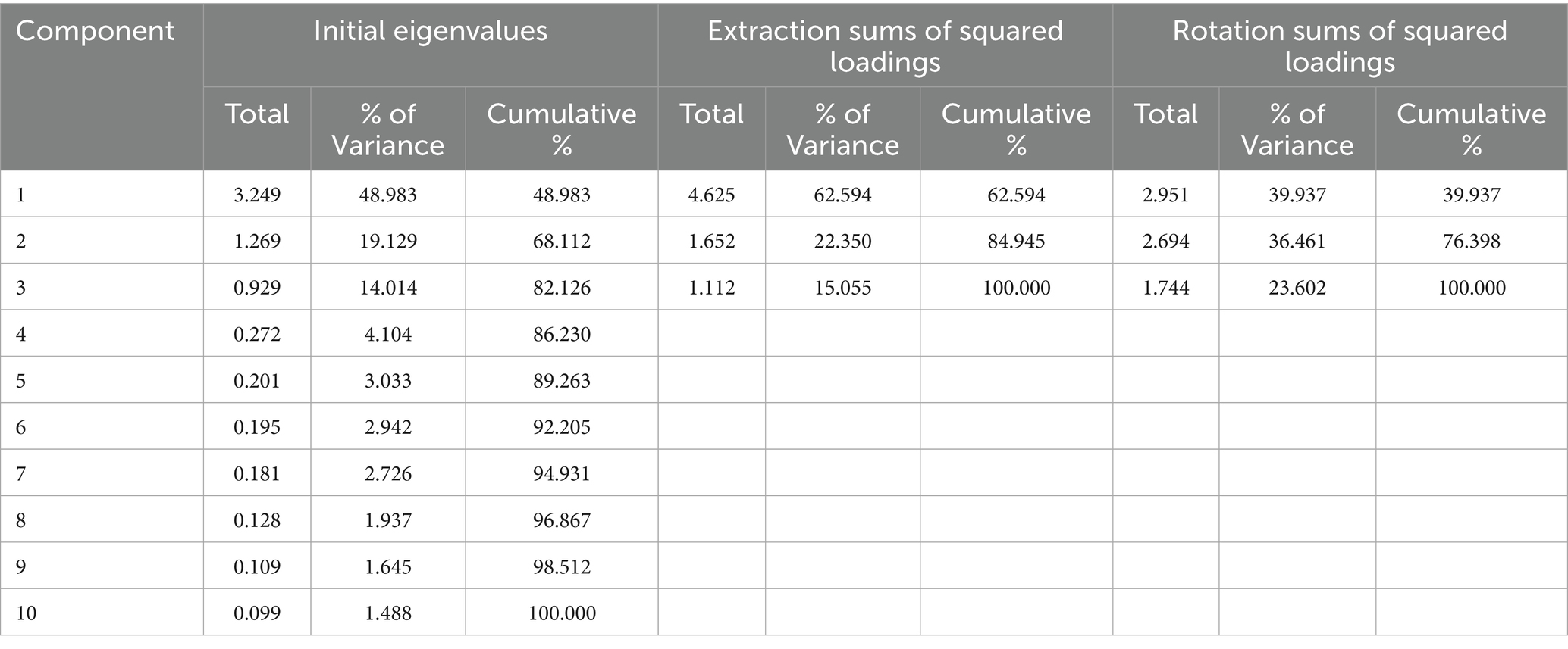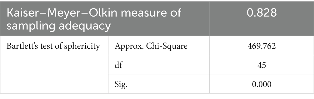 Table 3 displays the Kaiser-Meyer-Olkin (KMO) measure results evaluating sampling adequacy. The obtained KMO value of 0.828 substantially exceeds the minimum threshold of 0.50. Bartlett’s Test of Sphericity reached statistical significance (p < 0.001), confirming the correlation matrix significantly deviates from an identity matrix. An identity matrix configuration, characterized by zero inter-item correlations and thus incompatible with factor convergence, was statistically rejected. These collective findings demonstrate robust data suitability for factor analysis.