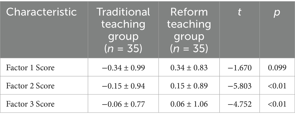 In Factor 1—Career Development, the reform teaching group scored higher (M = 0.34, SD = 0.83) than the traditional group (M = −0.34, SD = 0.99), with the difference approaching significance (t = −1.670, p = 0.099), suggesting that the reform teaching may enhance students’ awareness of career development. For Factor 2—Competency Enhancement, the reform teaching group scored significantly higher than the traditional group (t = −5.803, p < 0.01), indicating that the reform significantly improved students’ overall competence. Regarding Factor 3—Course Satisfaction, the difference between groups was also significant (t = −4.752, p < 0.01), with the reform group outperforming the traditional group, reflecting strong student recognition of the course’s effectiveness and teaching format.