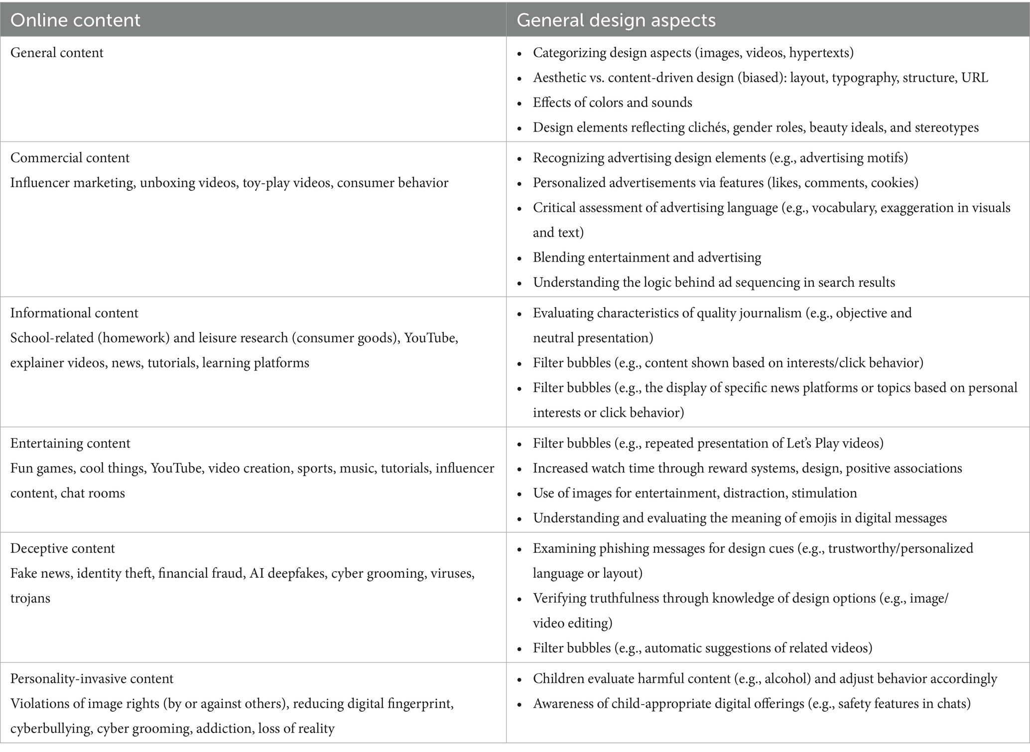 Based on established theoretical and normative models as well as empirical research findings, a conceptual framework for evaluating online content for elementary school children has been developed (Jocham and Pohlmann-Rother, 2025, in review). At its core, the framework comprises four evaluation criteria, which are applied across five distinct content areas (see Figure 1). These criteria include the evaluation of design aspects, credibility, closeness to reality, and the identification of characteristics relevant to evaluation. The criteria can be applied to entertaining, knowledge-transferring, commercial, deceptive, and personality-impairing online content (content areas). The following section provides definitions of the four evaluation criteria and five content areas, which are not exclusively intended for elementary school children (ages 6–10 in Germany). The presented research findings serve to further specify these criteria, highlighting that the context of application may vary (e.g., fake news) or that criteria may be emphasized (e.g., the evaluation of expertise).