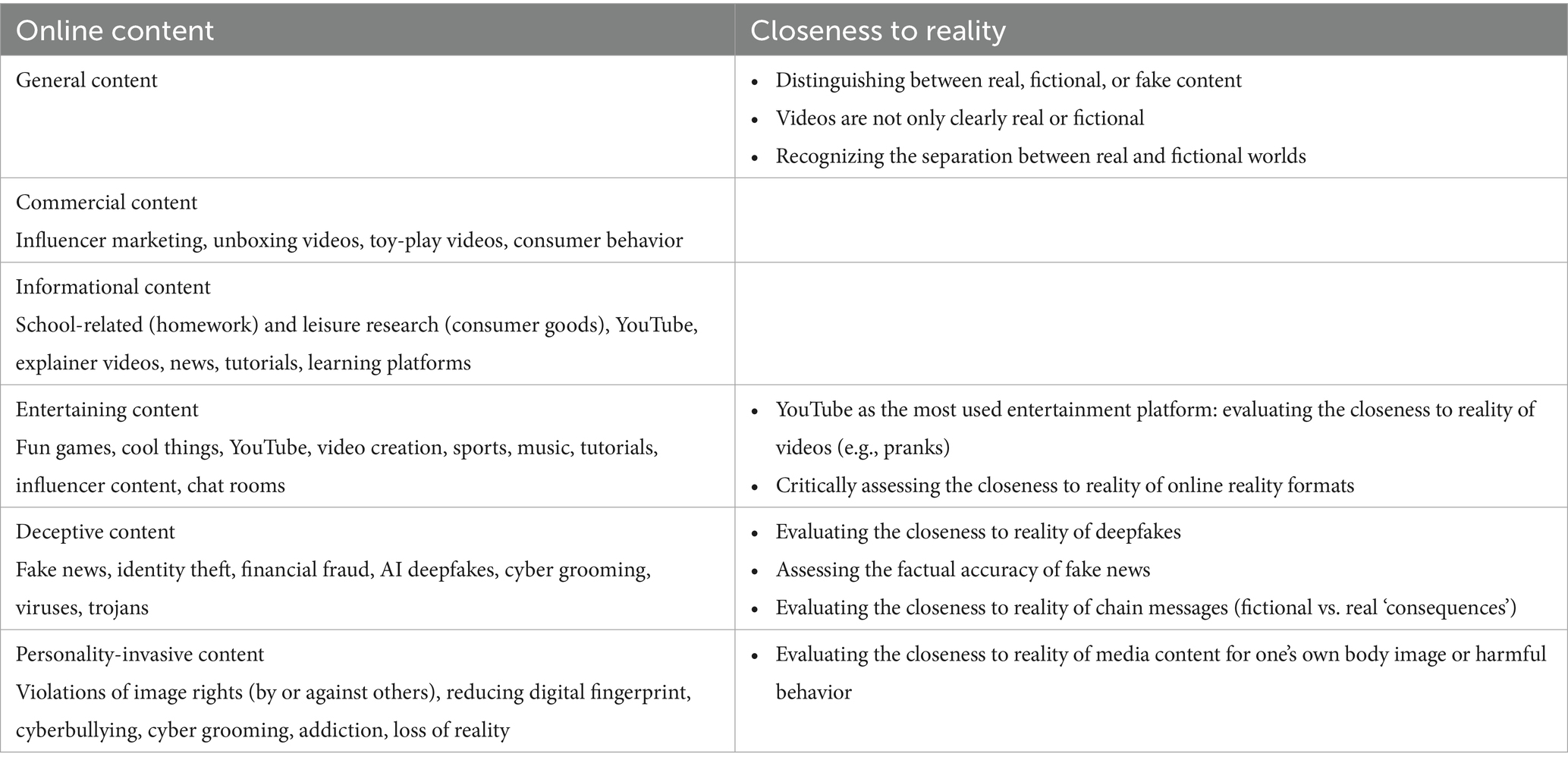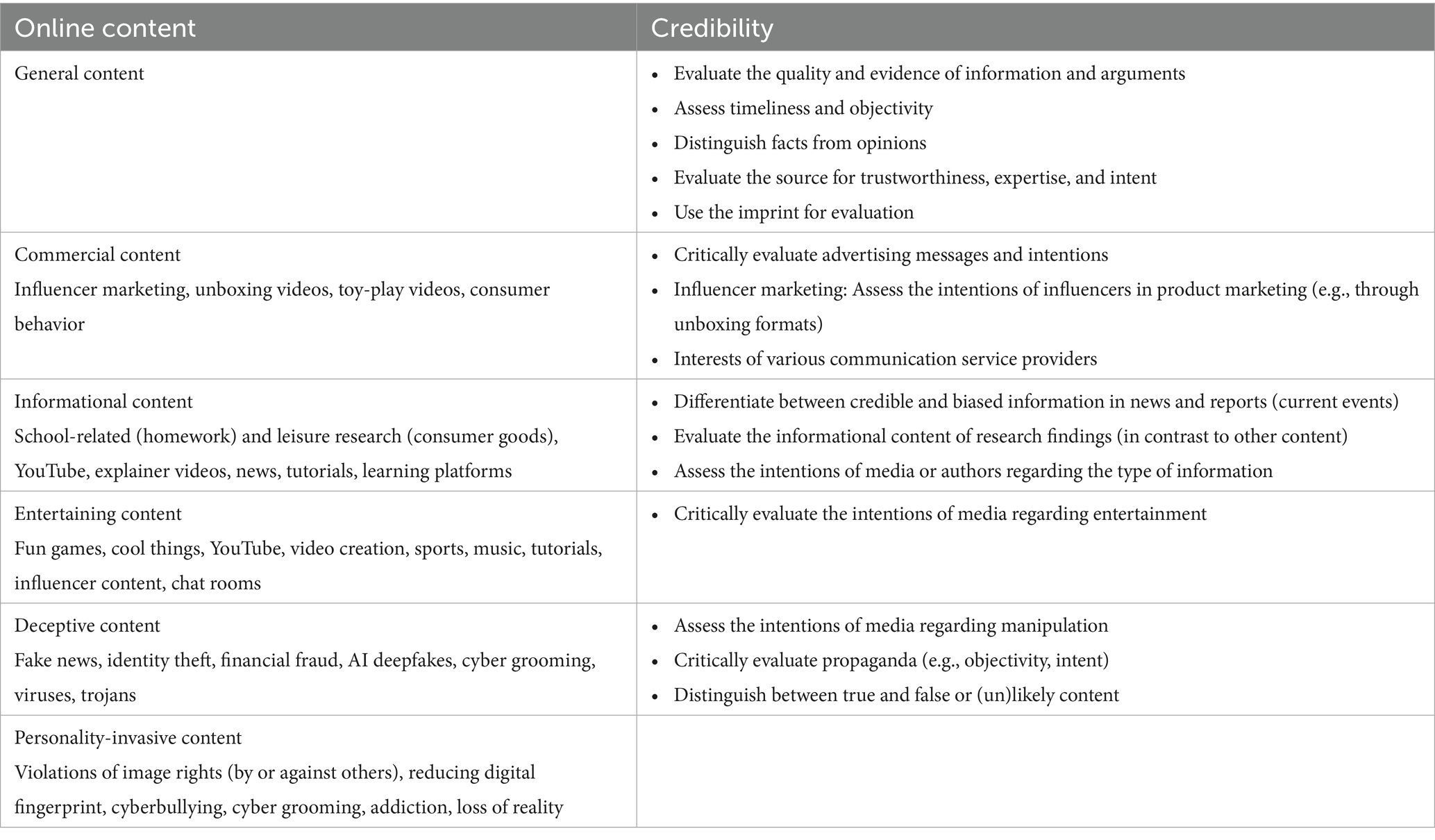 As shown in Table 3, not all content areas could be specified to the same extent based on the combined insights from curricula, interview data, and previous research. Nevertheless, the findings can be transferred to incomplete or vague online content. For example, criteria used to evaluate the closeness to reality of deceptive online content (e.g., real vs. fictional deepfakes) can also be applied to commercial online content (e.g., real vs. fictional advertising videos, such as exaggerated claims in promotional messages). The same applies to the evaluation of closeness to reality in news content, which can be assessed for its degree of factual accuracy.
