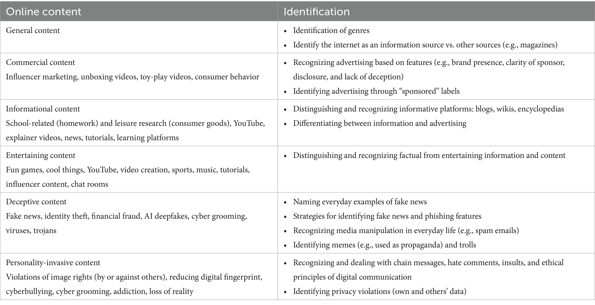 During both academic and recreational online activities, children inevitably encounter commercial and deceptive content. Advertising includes influencer marketing, which many brands use—sometimes exclusively—to promote their products (De Veirman et al., 2017). In the toy industry, for instance, entertaining unboxing and toy-play videos are produced specifically to appeal to children (Radesky et al., 2020). Deceptive practices may include „lies, omission, evasion, equivocation and generating false conclusions with objectively true information” (Levine, 2014, p. 381). In digital environments, deception often manifests in the form of fake news, identity theft, phishing, financial fraud (Dale, 2019), such as Ponzi and pyramid schemes or scam cryptocurrencies (Chiluwa, 2019), AI-generated deepfakes (Weisberg et al., 2023), or cyber grooming (Singh and Gitte, 2014). However, elementary school children may not encounter all these phenomena.