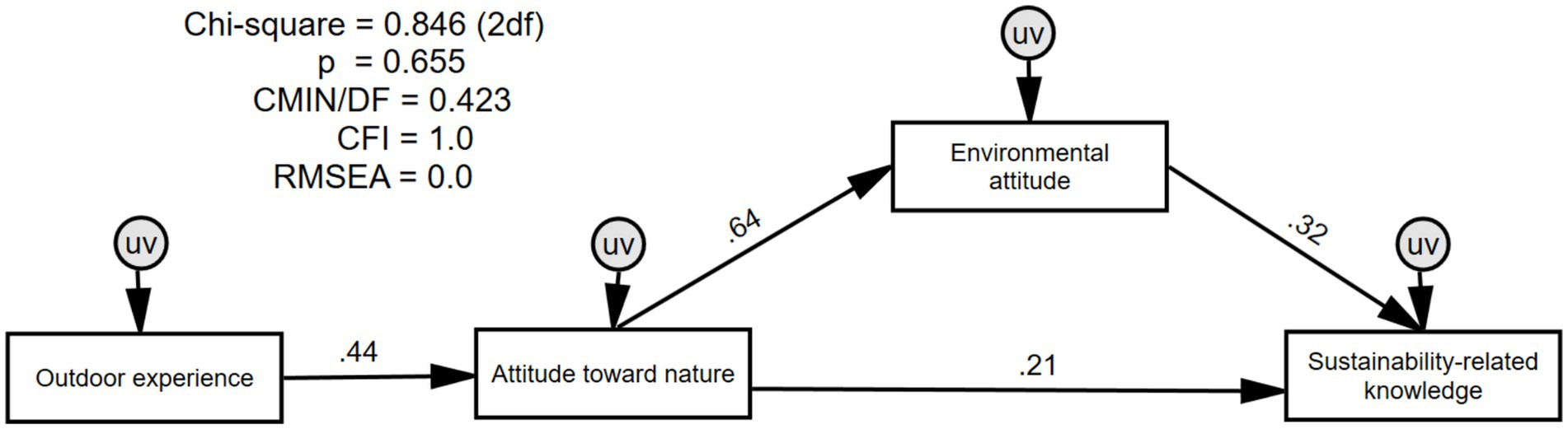 In the next step, we delved deeper into the relationships between the variables and worked toward creating an integrated sustainability model. Recent research suggested that environmental attitude may play a mediating role: While positive attitude toward nature levels influence the acquisition and retention of knowledge, environmental attitude seems to mediate this relationship (Baierl et al., 2024). We tested such a potential mediation and included an additional component: the impact of outdoor experiences, which positively contributes to attitudes toward nature (see Figure 1).