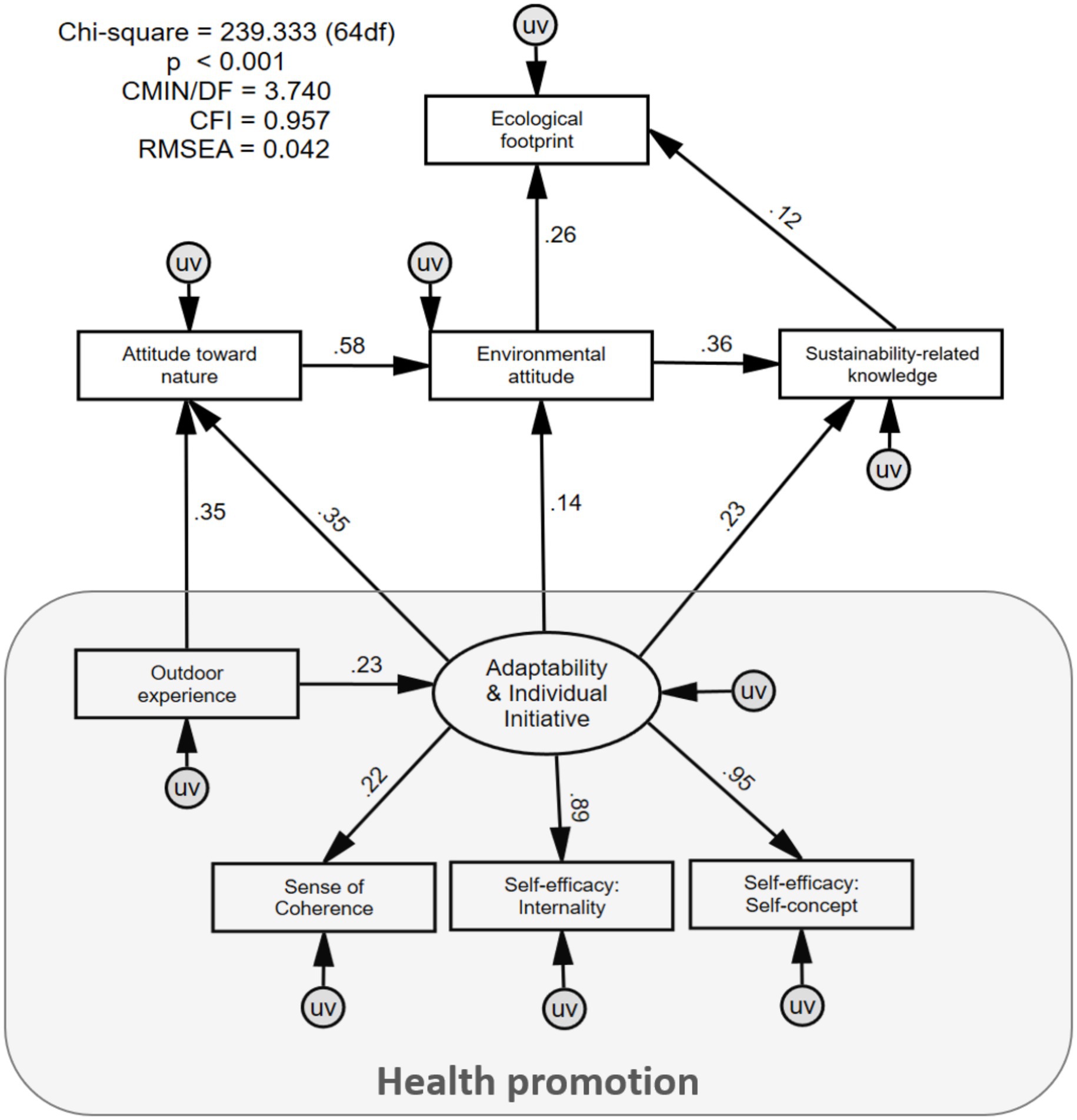 Furthermore, attitudes toward nature positively influence environmental attitudes (b = 0.58), which in turn facilitate both the acquisition of sustainability knowledge (b = 0.36) and the enactment of sustainable behaviors (b = 0.26). Importantly, while health-promoting factors contribute to the development of attitudes and enhance learning potential, knowledge alone appears to exert minimal influence on sustainability related behaviors (b = 0.12). Instead, environmental attitudes emerge as the primary driver of such behaviors (b = 0.26). These findings underscore a dynamic interplay between health promotion, attitudes toward nature, and environmental attitudes, collectively shaping sustainability engagement.