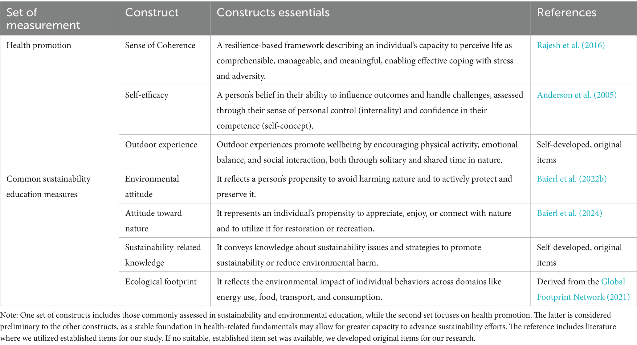 The comprehensive idea of health promotion and maintenance includes four constructs derived from the GreenComp framework (Biachni et al., 2022), acknowledging that health comprises physical, mental, and social wellbeing rather than the mere absence of disease (Antonovsky, 1996). The survey assessed the participants’ sense of coherence (Rajesh et al., 2016), outdoor experiences, and self-efficacy (Anderson et al., 2005).